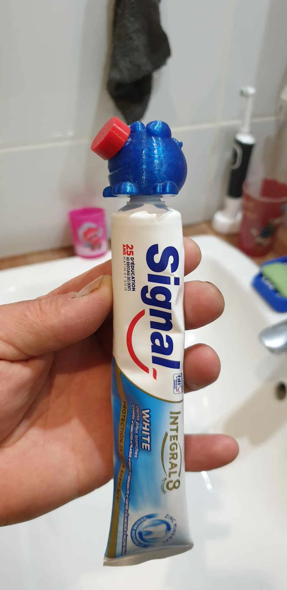 Đây là một mô hình của CliffGlanz (xin cảm ơn tác giả) và mình đã thêm cái nắp để kem đánh răng không bị khô và làm nghẹt lỗ.