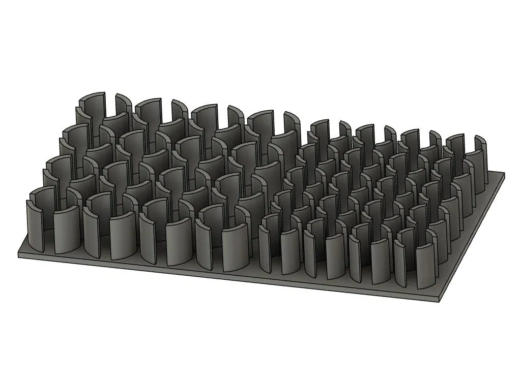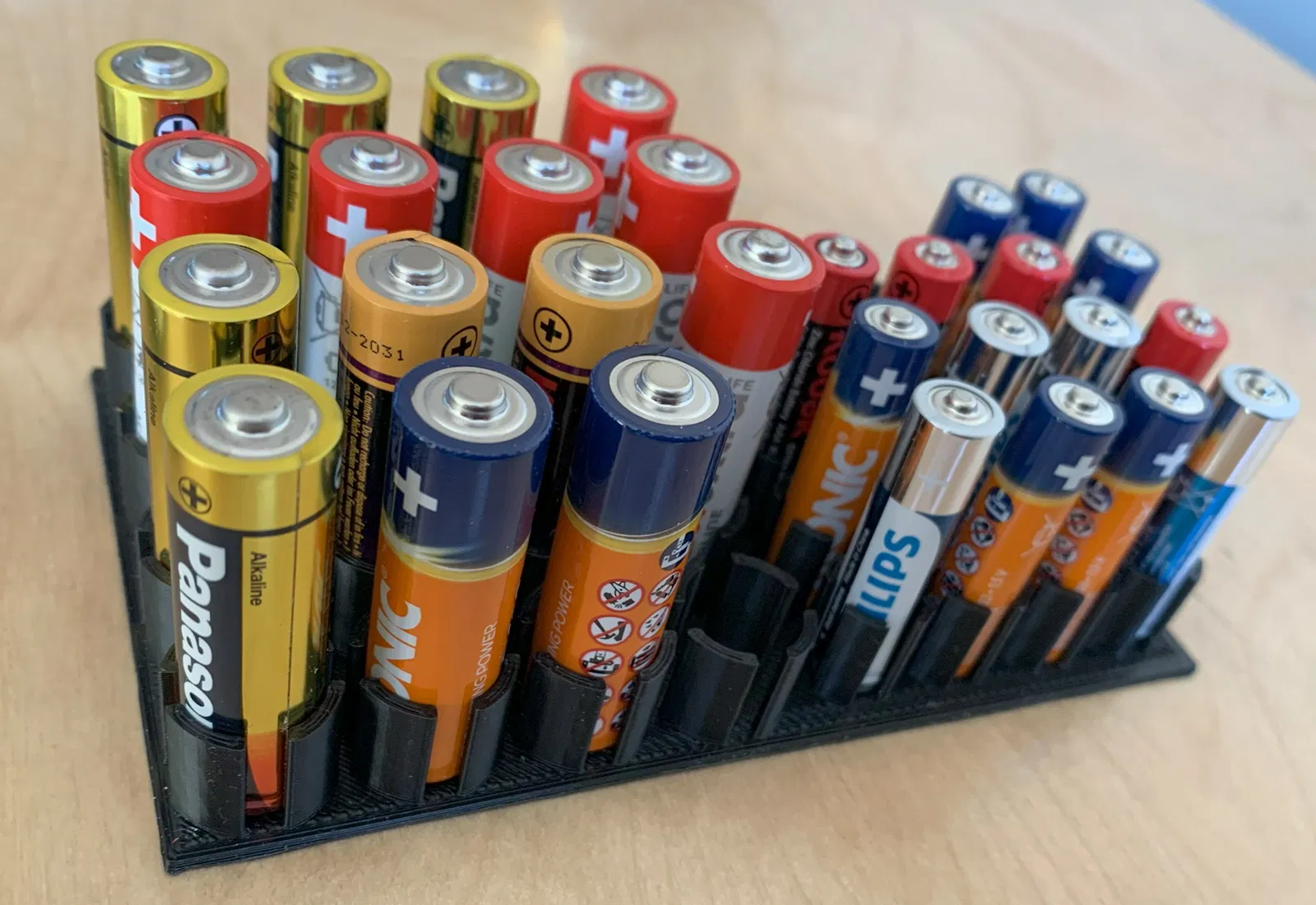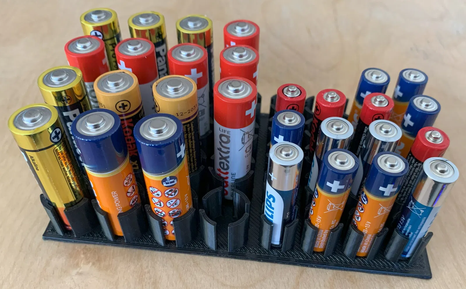 Chân đế cho pin AA và AAA, dùng tương đối ít nhựa in, thiết kế không dùng vật liệu độn. Kích thước là 80mm x 140mm x 17mm.