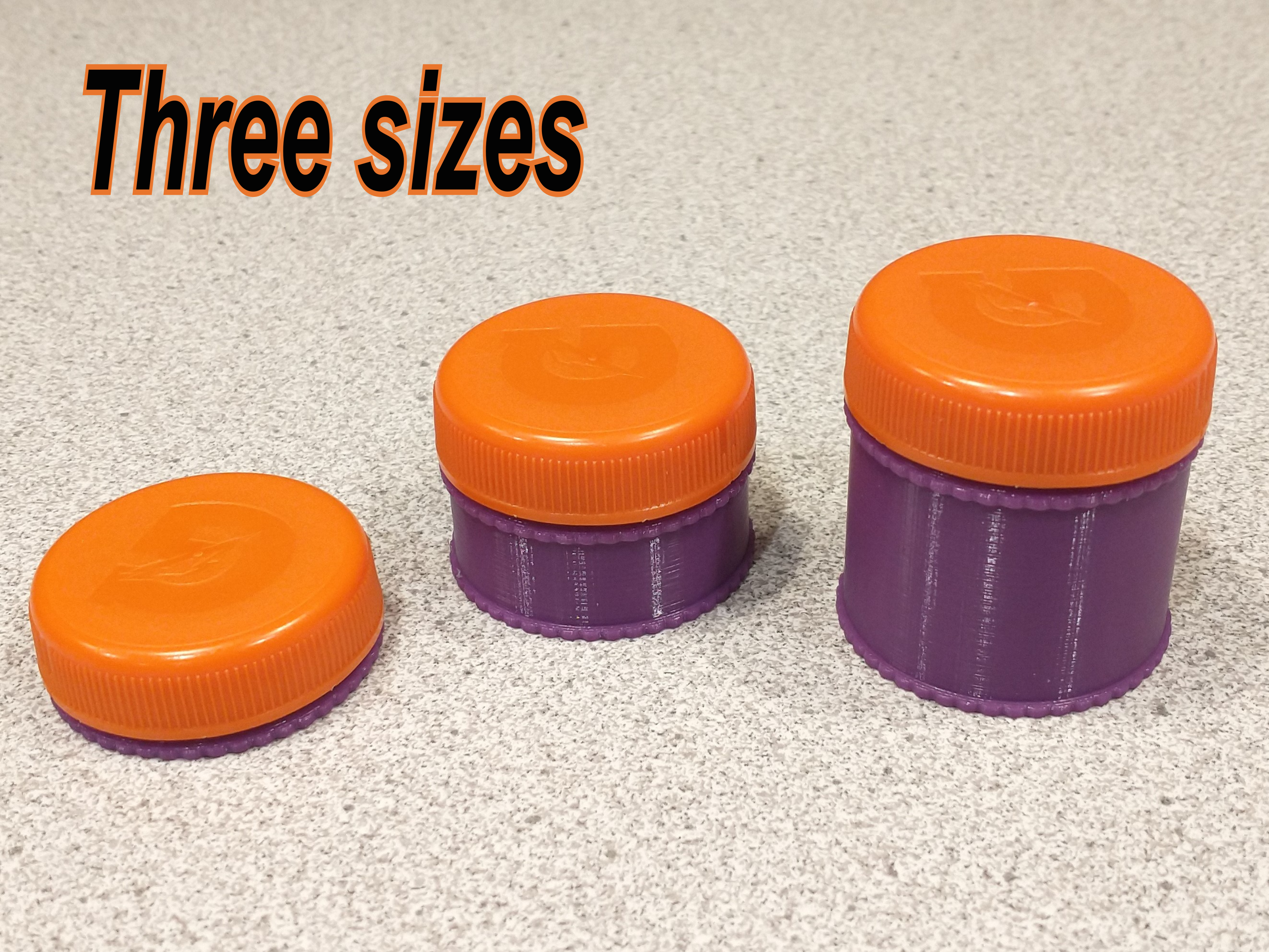 Đây là những cái hộp đựng mà xài nắp chai Gatorade 20oz (nắp chai Powerade tương tự cũng xài được luôn nha). Cái cỡ nhỏ là cỡ tối thiểu để xài được với mấy cái nắp chai này. Có thêm hai cỡ lớn hơn với chiều cao gấp đôi và gấp ba cỡ nhỏ.