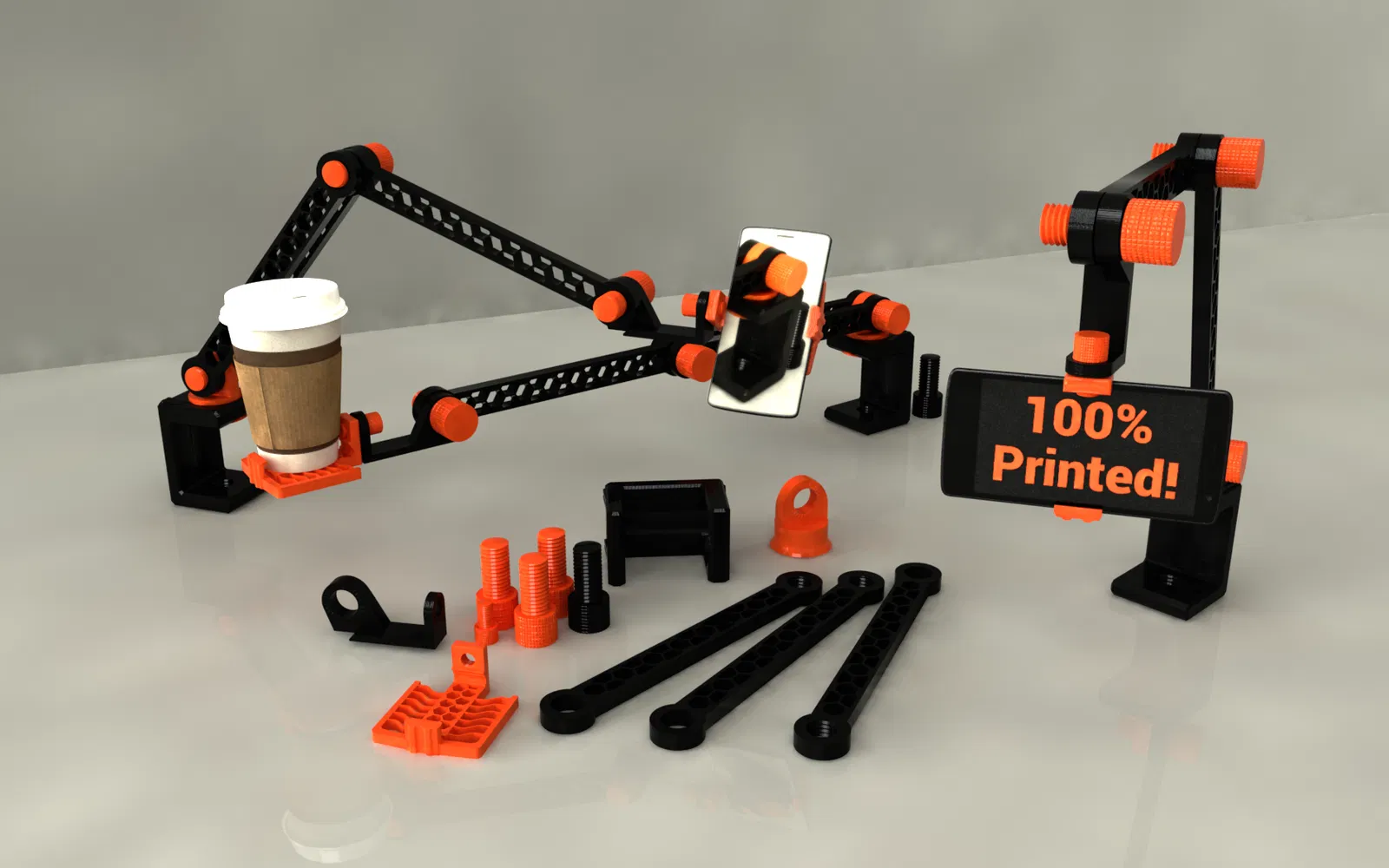 Cánh tay giữ điện thoại in 100% từ máy in 3D, với ít nhất ba trục chuyển động. Tùy chọn thêm các khớp nối kép giữa các trục. Ở cấu hình tiêu chuẩn, cánh tay này có thể dễ dàng đỡ khoảng 500 gram ở mọi vị trí.