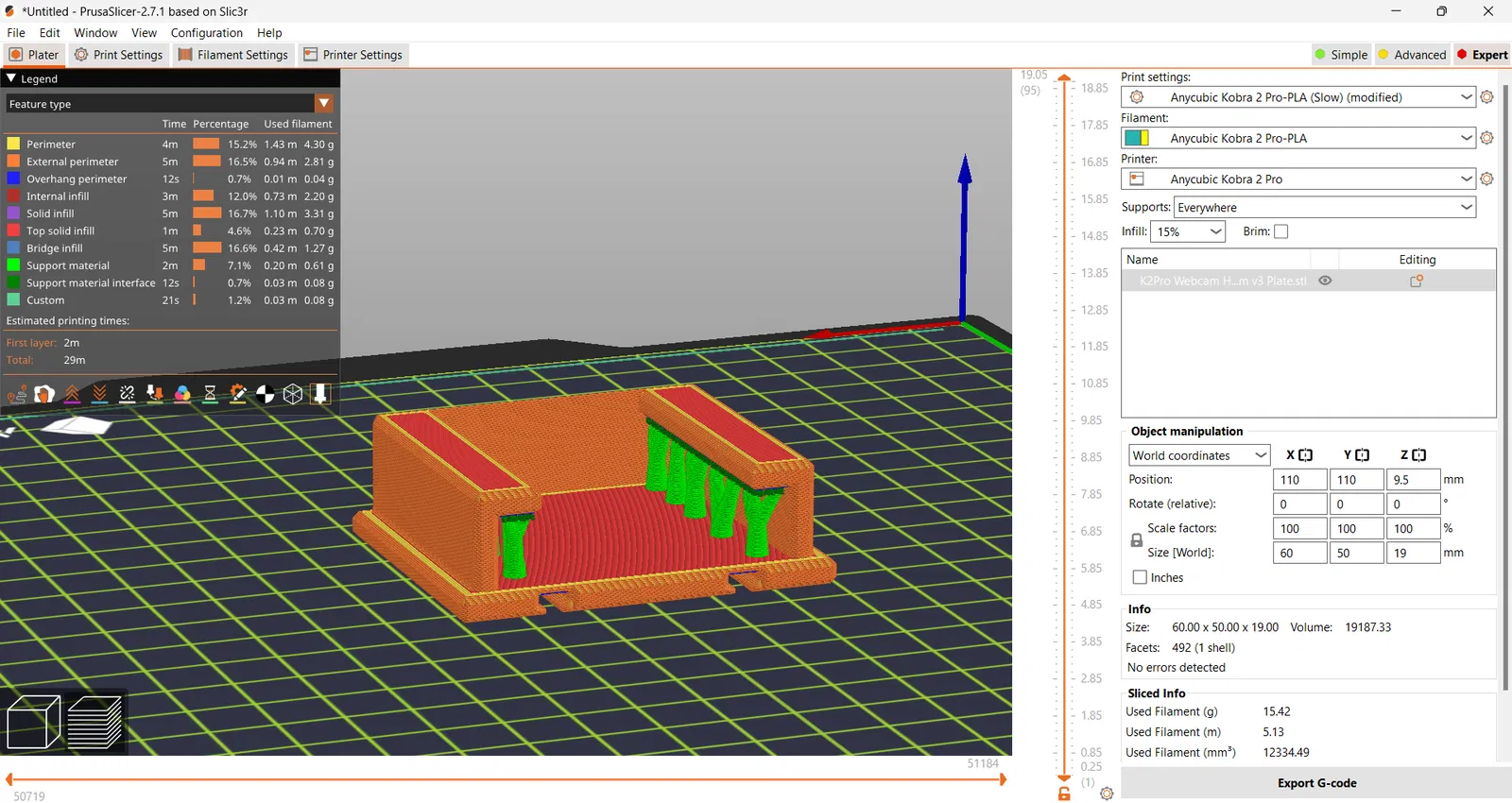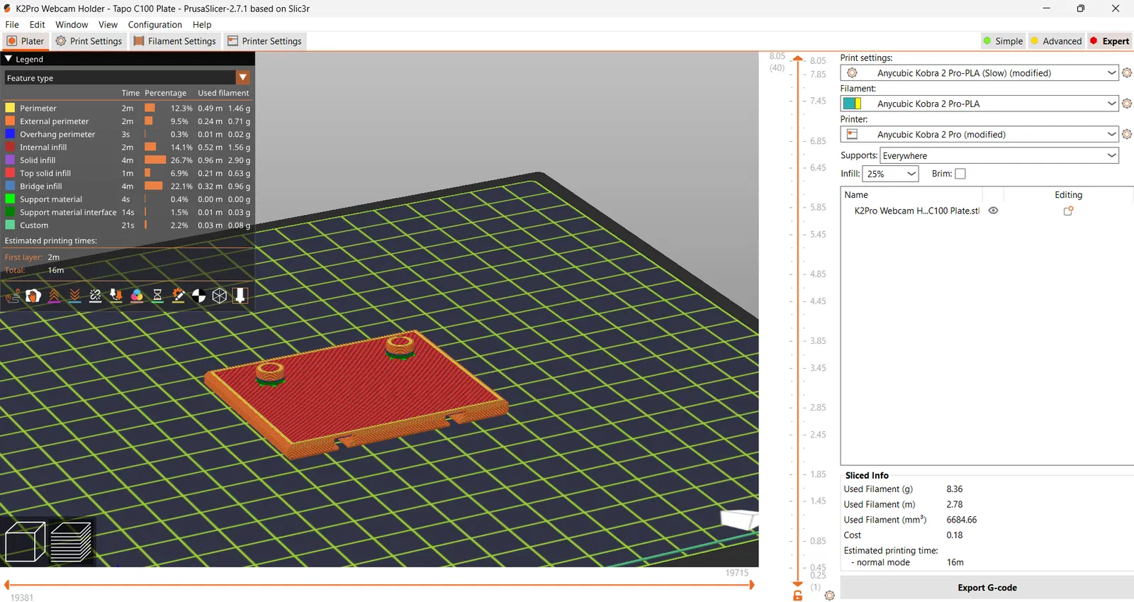 - LƯU Ý: do đặc điểm của camera này, lúc in cái plate này nhớ bật supports. Sẽ hơi khó gỡ ra nhưng mà dùng dao X-Acto / dao găm là được.