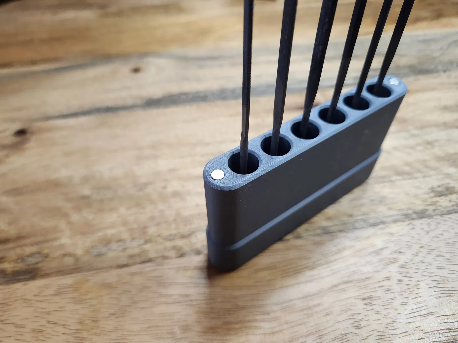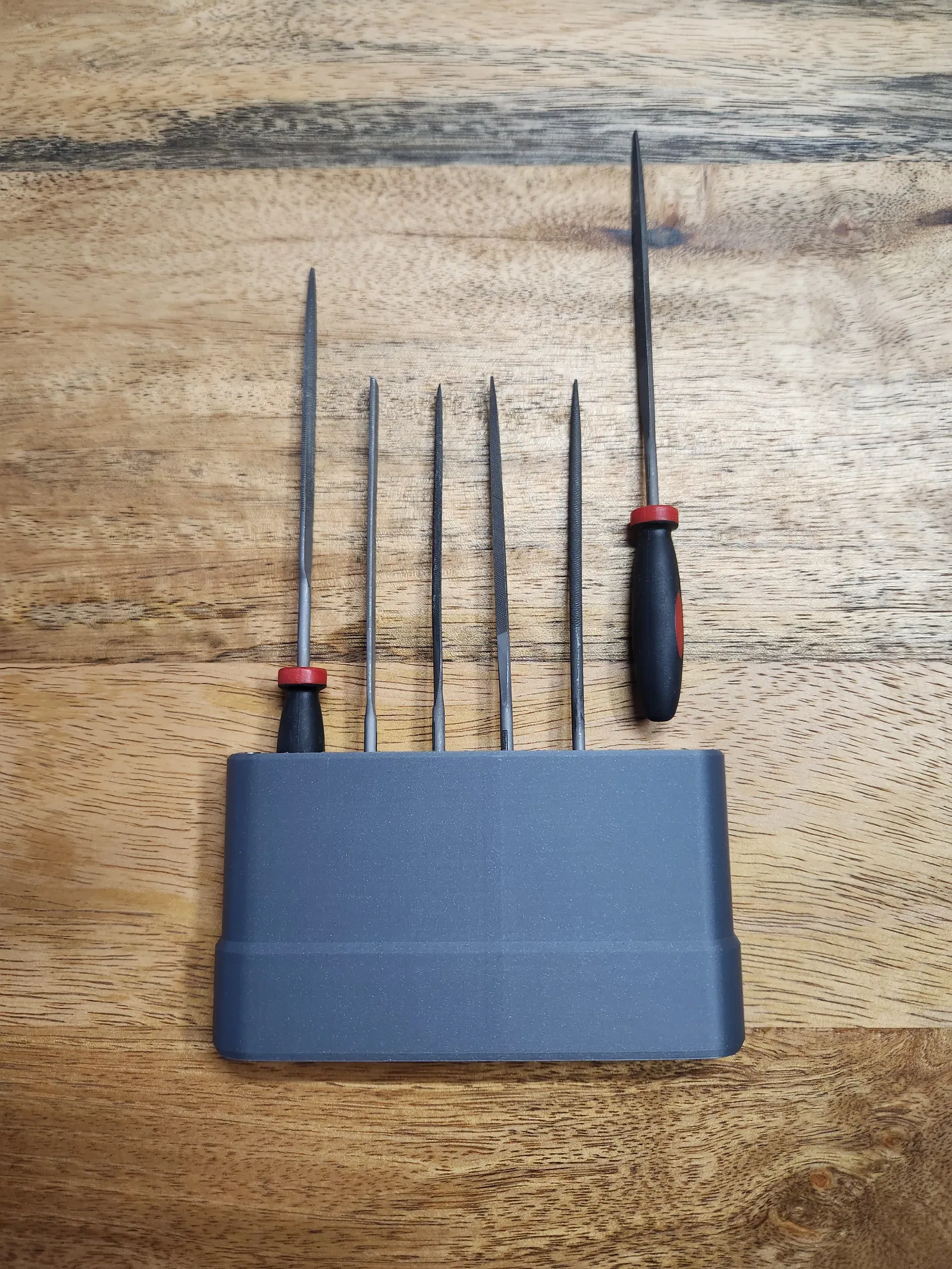 Cất giữ dũa gọn gàng với hộp đựng có nắp nam châm. Thiết kế cho 6 dũa, đặc biệt phù hợp với dũa có tay cầm rộng. Chỉ cần 4 viên nam châm 5x1mm. Lắp ráp đơn giản.
