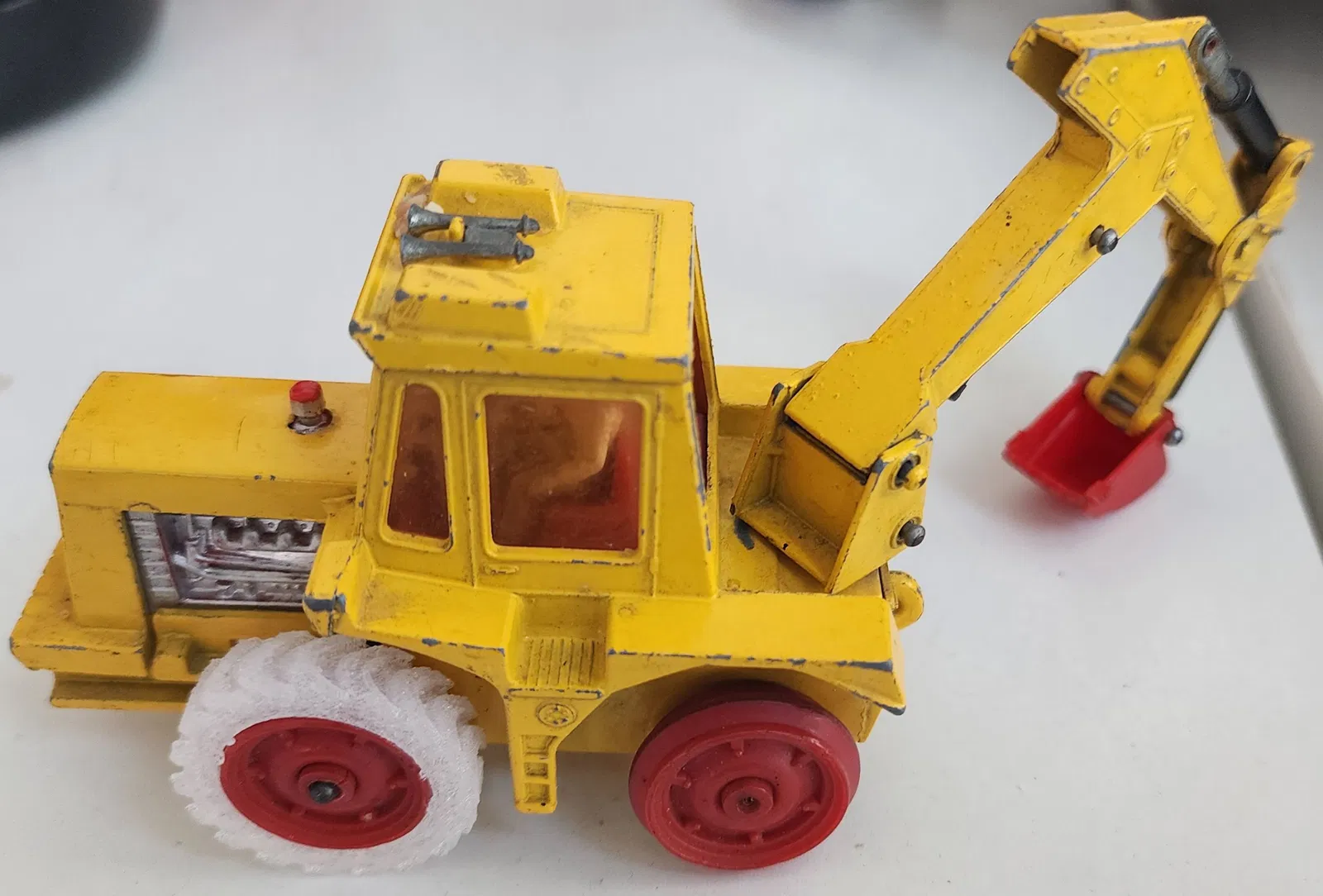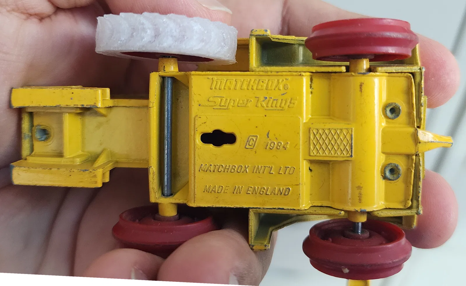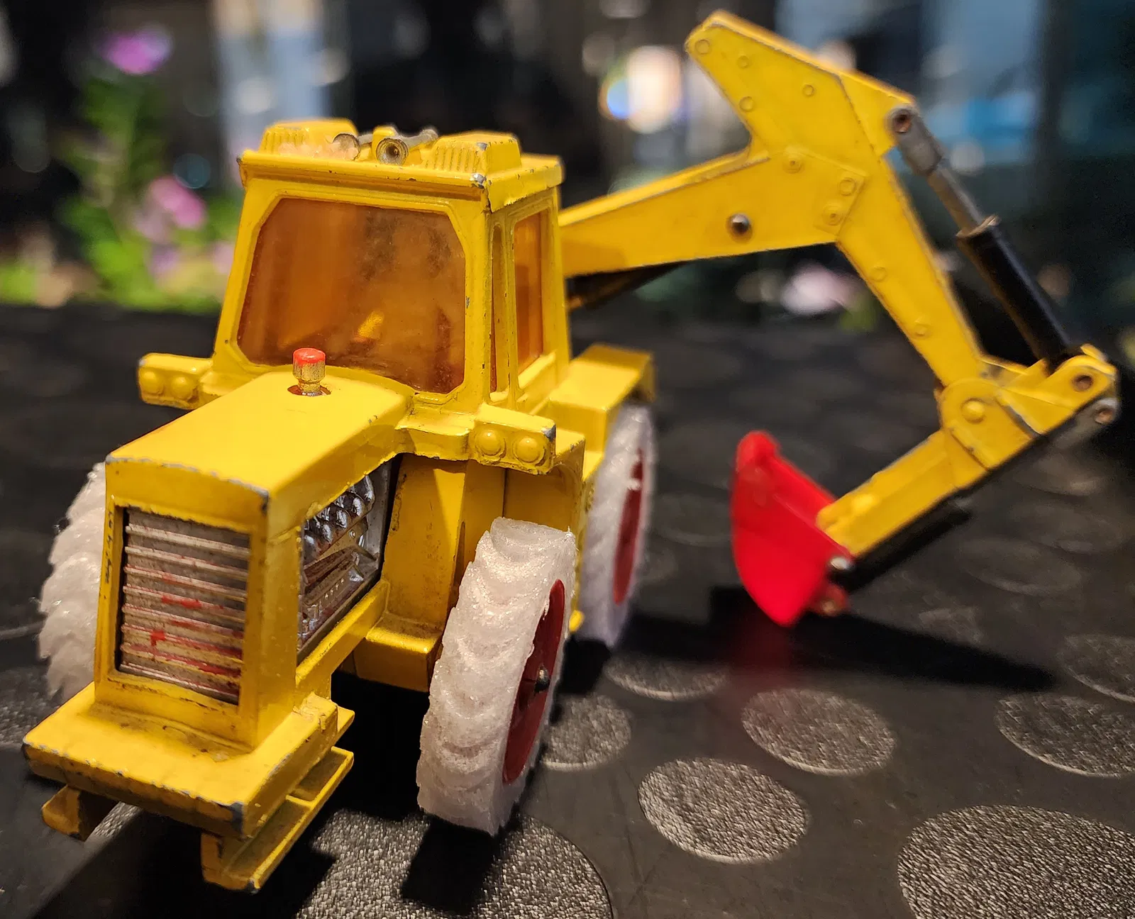 Ba tôi đã mua cho tôi một mô hình xe ủi đồ chơi bằng thép trong một chuyến đi đến Vương quốc Anh vào những năm 1980. Gần đây tôi tìm thấy nó trong nhà bố mẹ tôi, vẫn còn hoạt động tốt mặc dù lớp sơn/men đã bắt đầu bong tróc một chút. Tuy nhiên, lốp cao su nguyên bản đã bị phân hủy từ nhiều năm trước. Đây là lốp thay thế cho xe ủi đồ chơi, in bằng sợi nhựa dẻo.