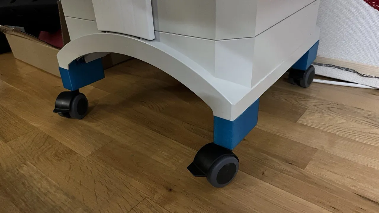 Bánh xe đi kèm đã bị cong và không phù hợp cho sàn gỗ và gạch, vì vậy việc sử dụng bánh xe tiêu chuẩn cho ghế văn phòng là một ý tưởng tốt. Tôi đã chế tạo một giá đỡ phù hợp với các thanh đỡ lõm ở dưới cùng và bắt vít ở đó, như trước đây với cái gốc. Các giá đỡ thực sự được kẹp chặt, nhưng có thể được cố định bằng vít. 4x vít M5x20mm & đai ốc M5. In bằng PETG, chúng giữ khá tốt. Bánh xe đã sử dụng: https://www.amazon.de/gp/product/B07HN6M6MH/ref=ppx_yo_dt_b_search_asin_title?ie=UTF8&psc=1 Tôi đã chọn chúng vì các ống màu đen đã được bao gồm.