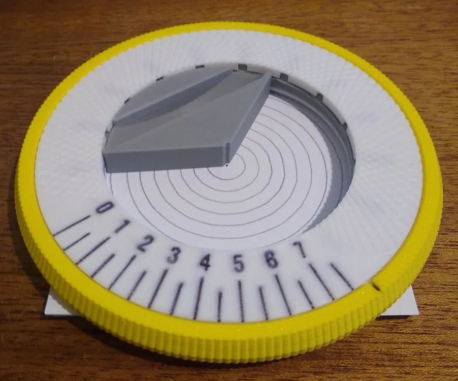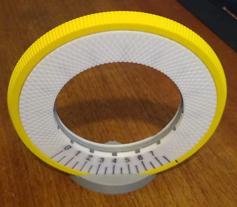 Tui đã thử in một cái với khe hơi lỏng để có thể nhấc vòng tròn ra khỏi đế, và một cái với khe vừa khít để nó đứng thẳng và khi nhấc vòng tròn lên thì dụng cụ dẫn hướng cũng đi theo, và tui thích cái sau hơn vì tui có xu hướng muốn dùng cả dụng cụ dẫn hướng khi sử dụng nó. Nên tui đã giữ lại phiên bản vừa khít (cũng có rãnh dẫn hướng lớn hơn, tốt hơn) và đó là cái có trên đây.