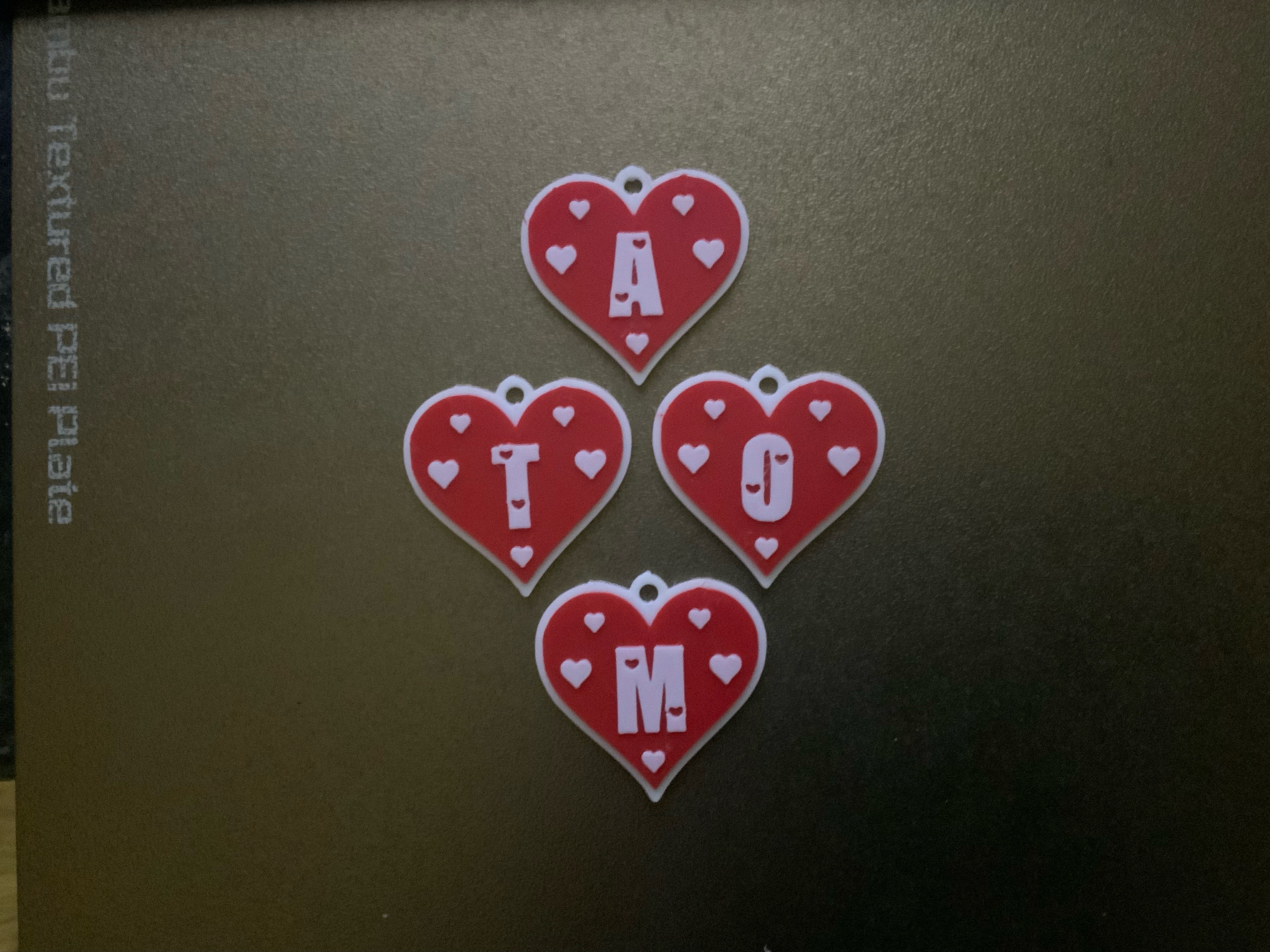 gói 1 trong 2 bộ chữ cái hình trái tim tình yêu đầy đủ làm móc khóa / mặt dây chuyền có thể dùng làm móc khóa hoặc gắn vào dây chuyền làm mặt charm tất cả móc khóa của mình đều được xếp lớp để tạo chiều sâu với màu đen ở phía sau nên sẽ ít hoặc không bị lem màu mời bạn xem thêm các mẫu móc khóa khác của mình bằng cách nhấn vào hồ sơ của mình hoặc qua link này **https://www.f3d.vn/profile/terrydiamond_1276993