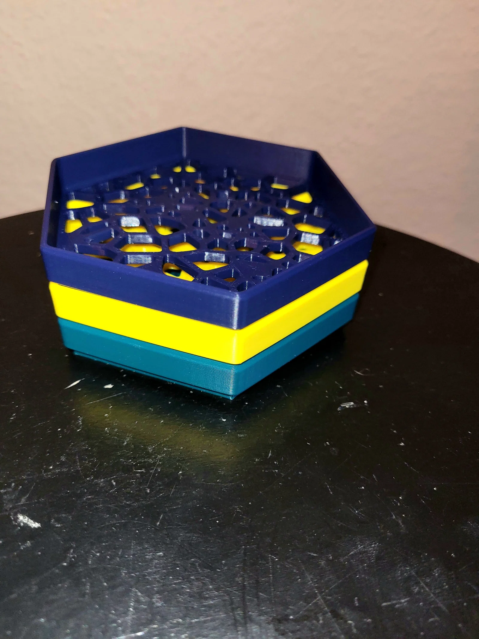 Khay lục giác Voronoi xếp chồng lên nhau, có 3 kích cỡ khác nhau với 3 họa tiết độc đáo cho mỗi loại. Kích thước cao 14mm, đường kính ngoài 100, 160, 200mm. Dễ in, không cần support, dùng PLA là ok.