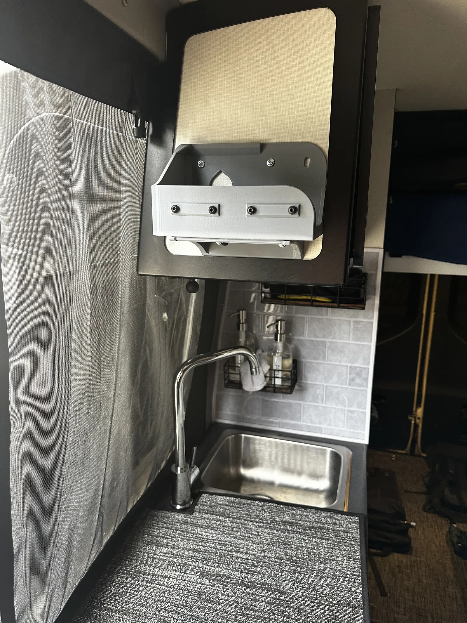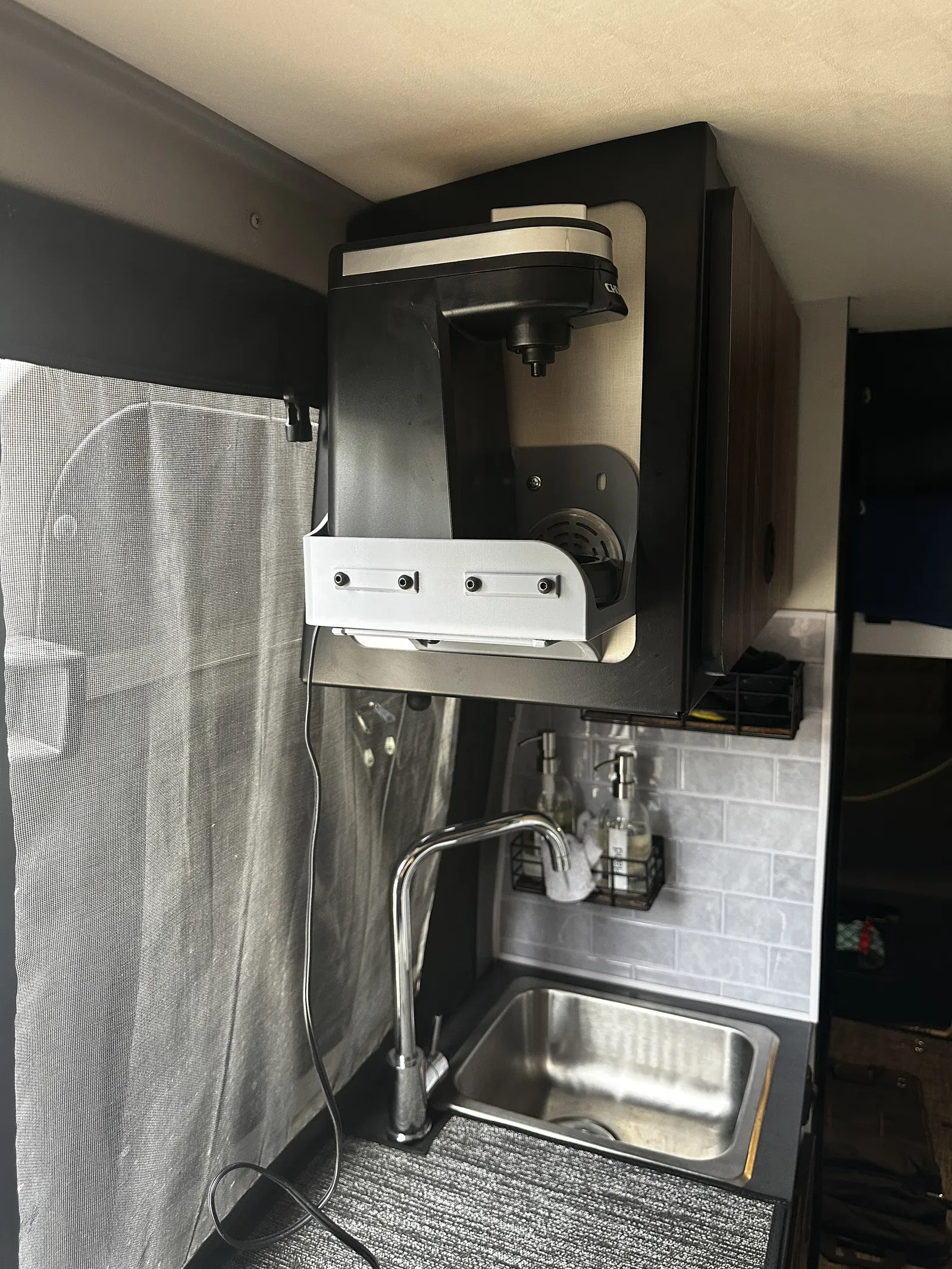 Em thiết kế cái này đặc biệt để gắn máy pha trà/cà phê của em lên tường trong chiếc xe Winnebago Revel class b của em. Nó có thể dễ dàng tùy chỉnh để phù hợp với các loại máy pha chế khác hoặc các loại máy có kích thước tương tự. Loại máy em dùng có nút nguồn ở cạnh bên trong.