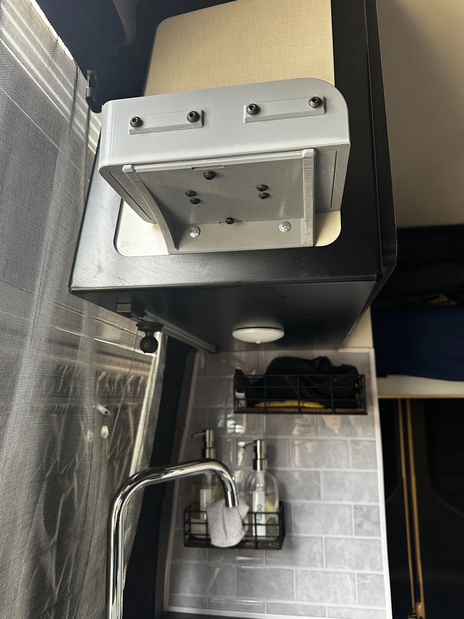 Kệ treo tường được thiết kế riêng cho xe Vanlife, dùng để gắn máy pha trà/cà phê kiểu Keurig. Dễ dàng tùy chỉnh cho máy khác, có rãnh gắn phụ kiện và giữ máy bằng velcro chắc chắn.