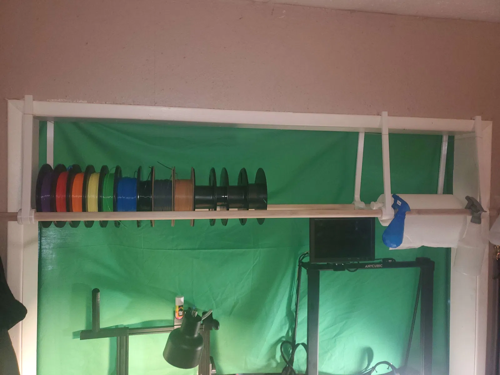 Tận dụng khung cửa ra vào với hai thanh gỗ hoặc ống nhựa cùng dây thun để tạo thêm không gian lưu trữ cuộn chỉ in 3D. Giải pháp tuyệt vời cho phòng trọ chật hẹp.