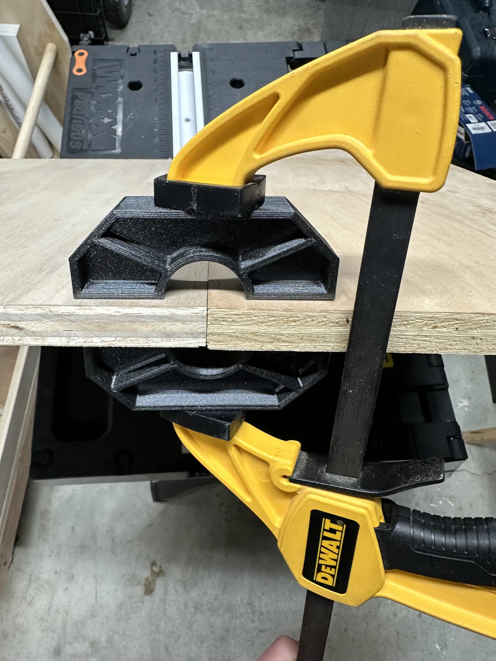 Một bộ gá kẹp dùng để căn chỉnh hai miếng gỗ, thường dùng cho việc ghép mộng. Bộ phận này chắc chắn, có thể chịu lực kẹp lớn, hữu ích cho việc dán hoặc ghép mộng bằng mộng (dowel). Nên in nằm xuống để tăng độ bền và có thể cần chà nhám các mặt tiếp xúc với gỗ.