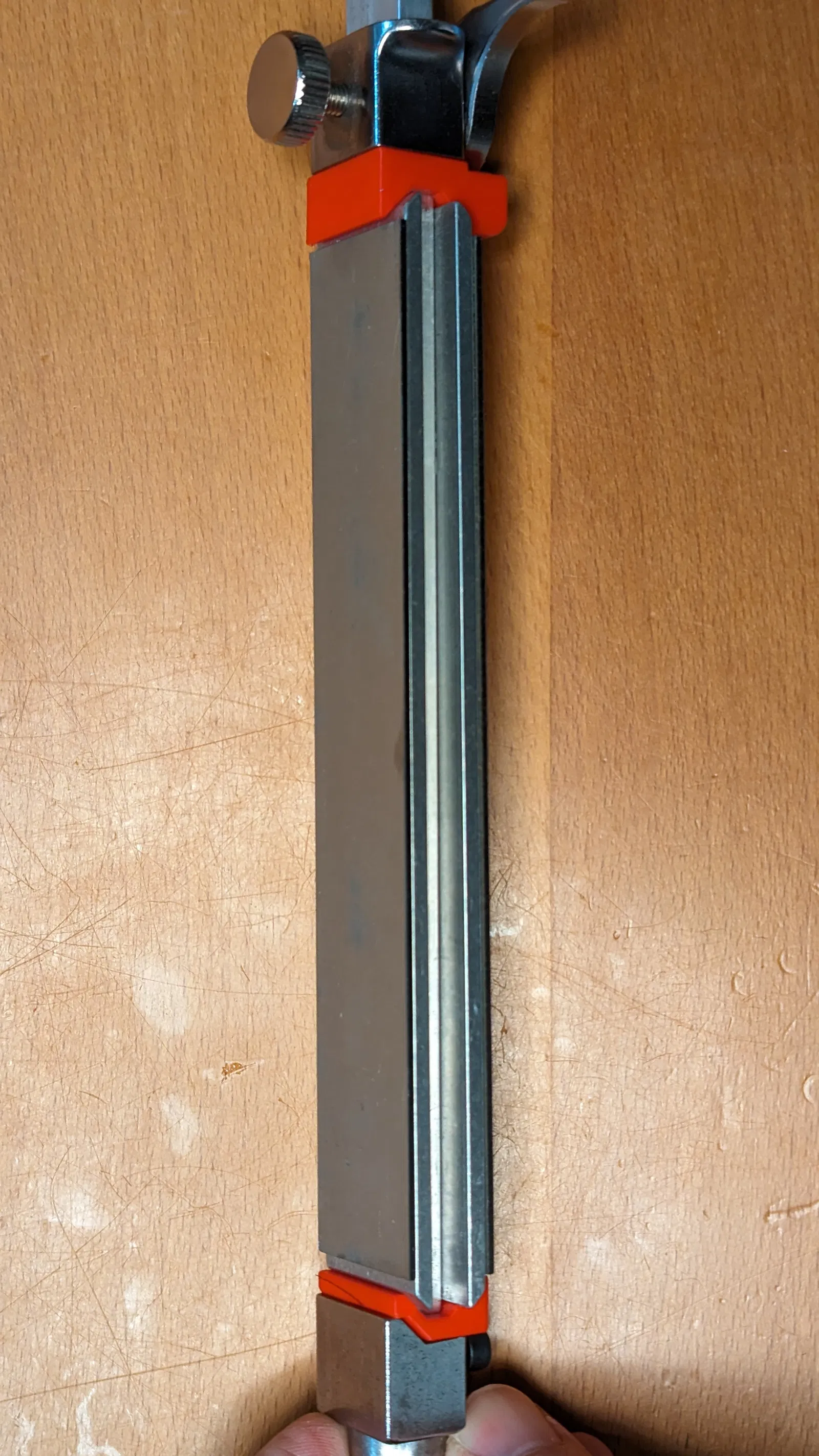 Cái này thay thế cái tấm kim loại phẳng ở một đầu của giá đỡ đá mài bằng một giá đỡ vát, giúp giữ đá mài có đế chắc chắn hơn nhiều. Đá mài kiểu EdgePro đã được gắn đế.