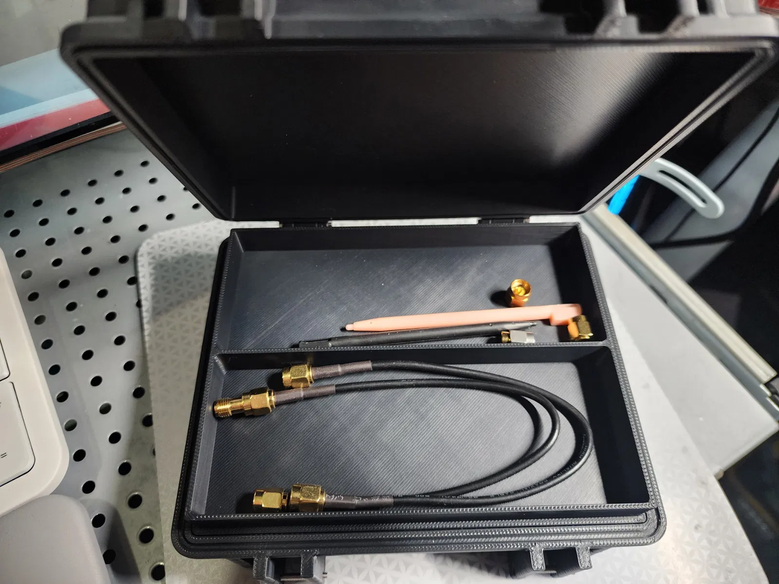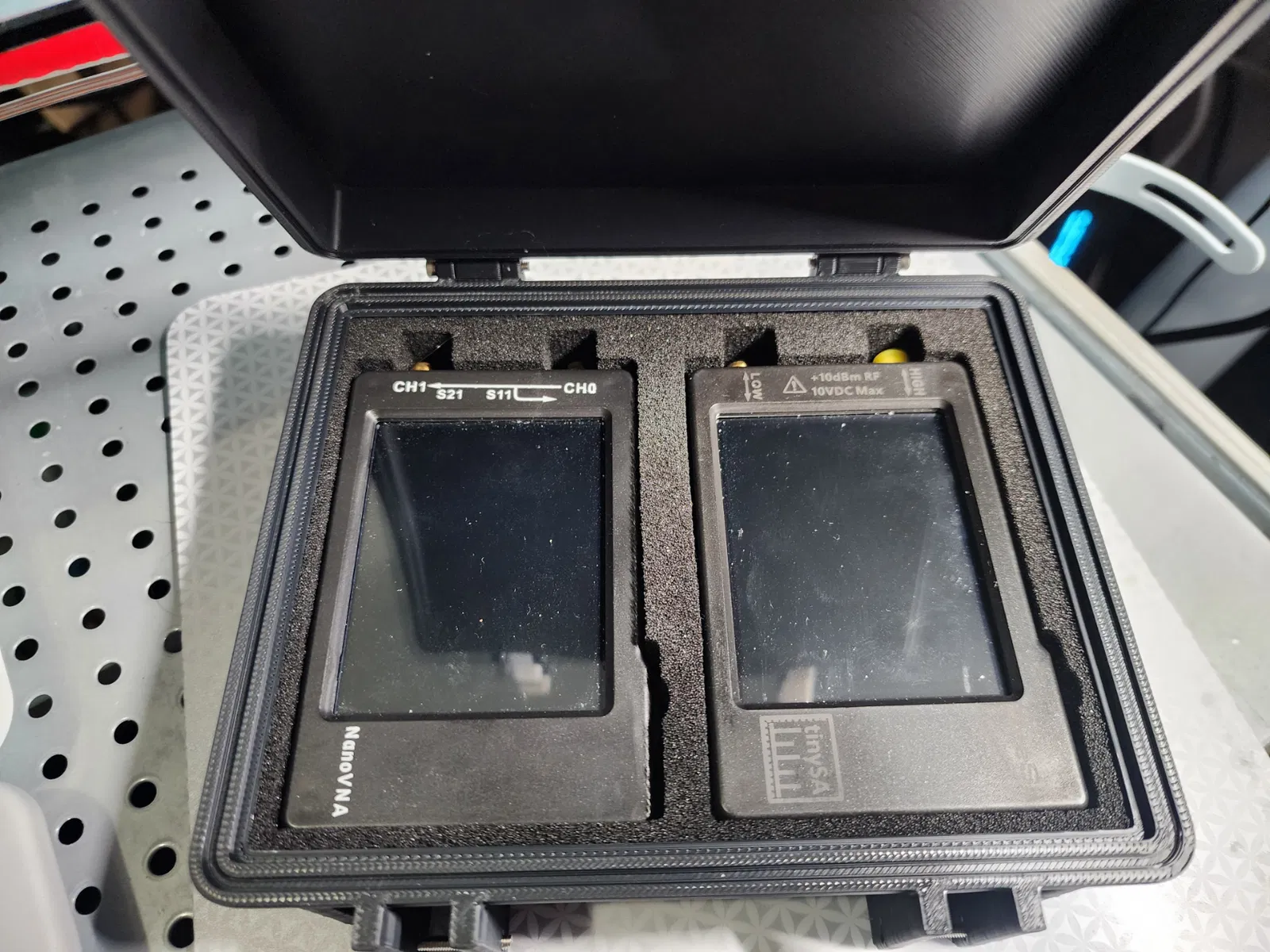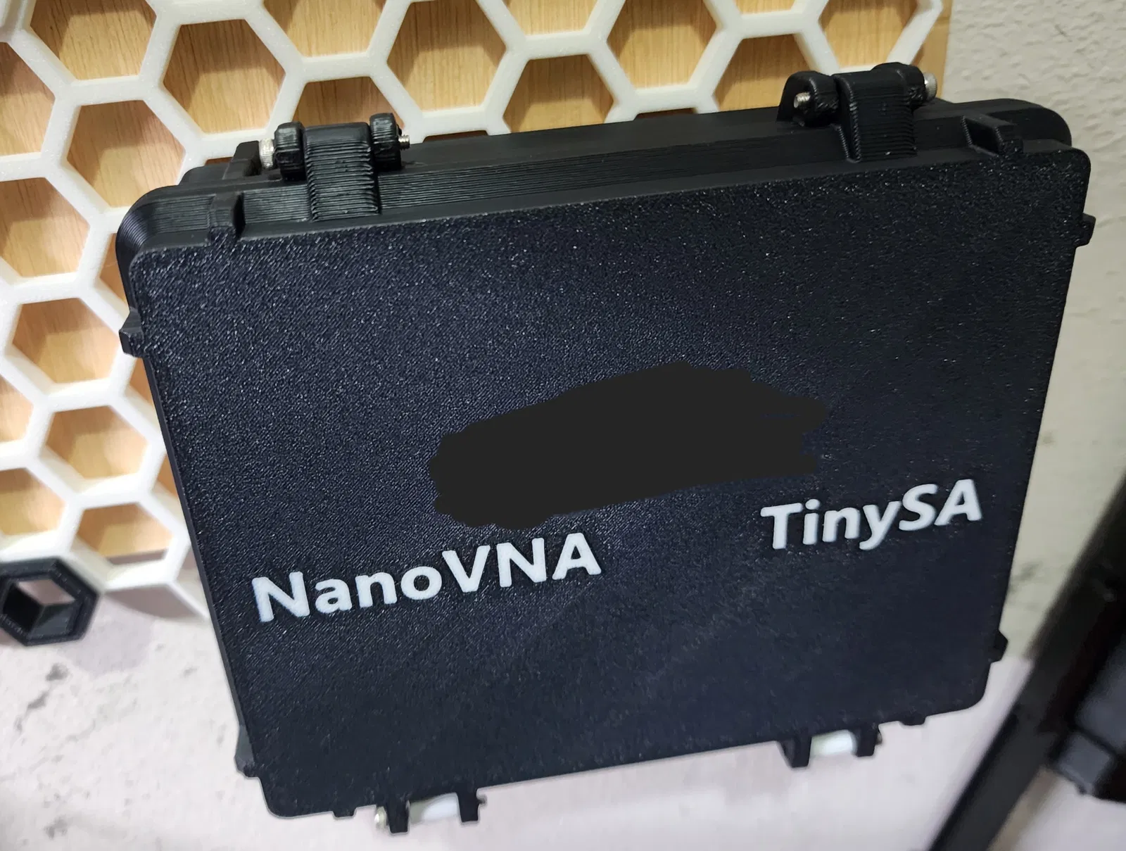 Tôi đã làm một chiếc hộp bán cứng để đựng cả NanoVNA và TinySA của mình lại với nhau, giúp chúng được bảo vệ. Hộp có tích hợp gờ giữ thiết bị, sử dụng ốc M2.5 và nam châm M8x3 để gắn vào Honeycomb Storage Wall.