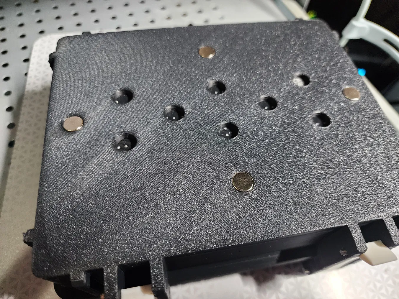 Tôi đã thêm một số lỗ để ép nam châm M8x3 sao cho chúng thẳng hàng với khoảng cách của Honeycomb Storage Wall. Tôi thấy chỉ cần 4 nam châm ở xa nhất là đủ để giữ chặt. Tôi cũng đã tạo các nút bịt cho HSW với nam châm ép vừa vặn. Nó định tâm và giữ chắc chắn, dễ dàng tháo ra.