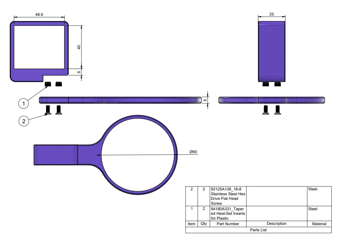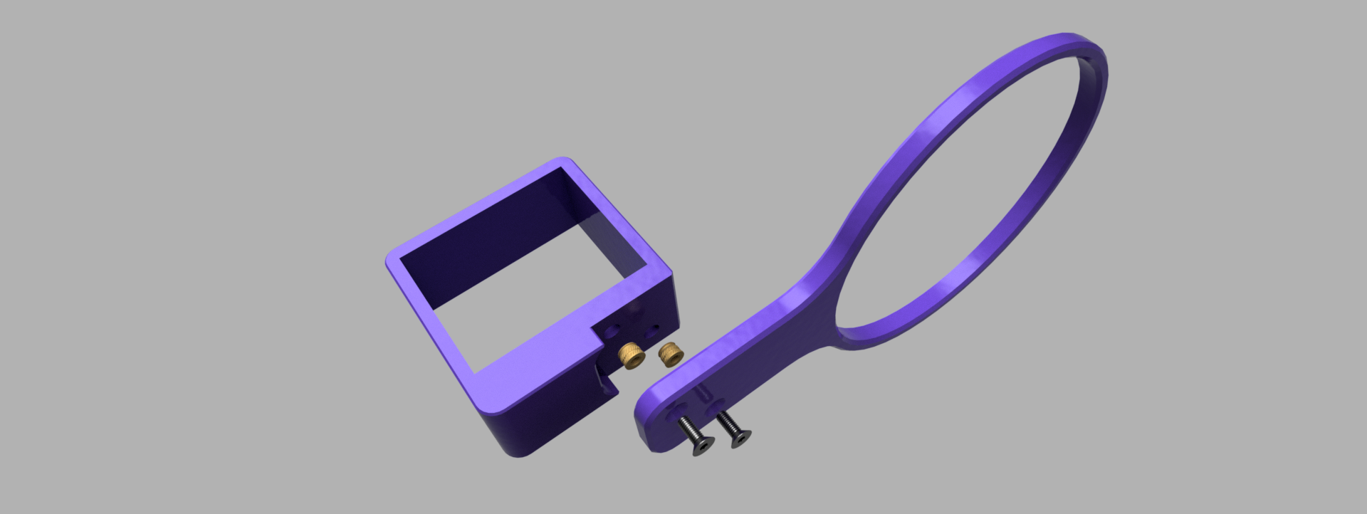 Cần lắp ráp, hai bộ phận ren nhiệt (heat inserts) cần được ép vào giá đỡ, chúng được thiết kế để phù hợp với lỗ 4.7mm cho ren nhiệt đường kính 5mm.