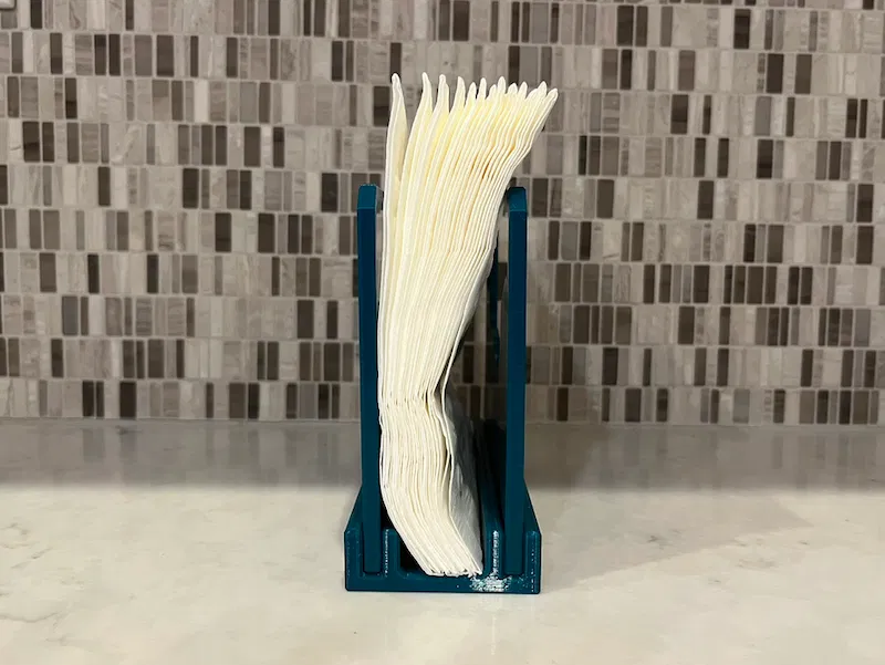 Đế đựng khăn ăn có thể thay đổi mặt, kèm 3 đế khác nhau. Kích thước khăn ăn ~165x165mm. Chi tiết in và thông số kỹ thuật được cung cấp đầy đủ cho từng bộ phận, bao gồm cả các lựa chọn khe hở khác nhau cho miếng hông.