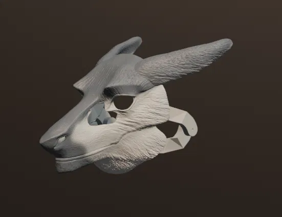 Mô hình mặt nạ sergal chân thật. Mô hình được tách thành nhiều phần: sừng/tai, bộ hàm và hàm trên và dưới.