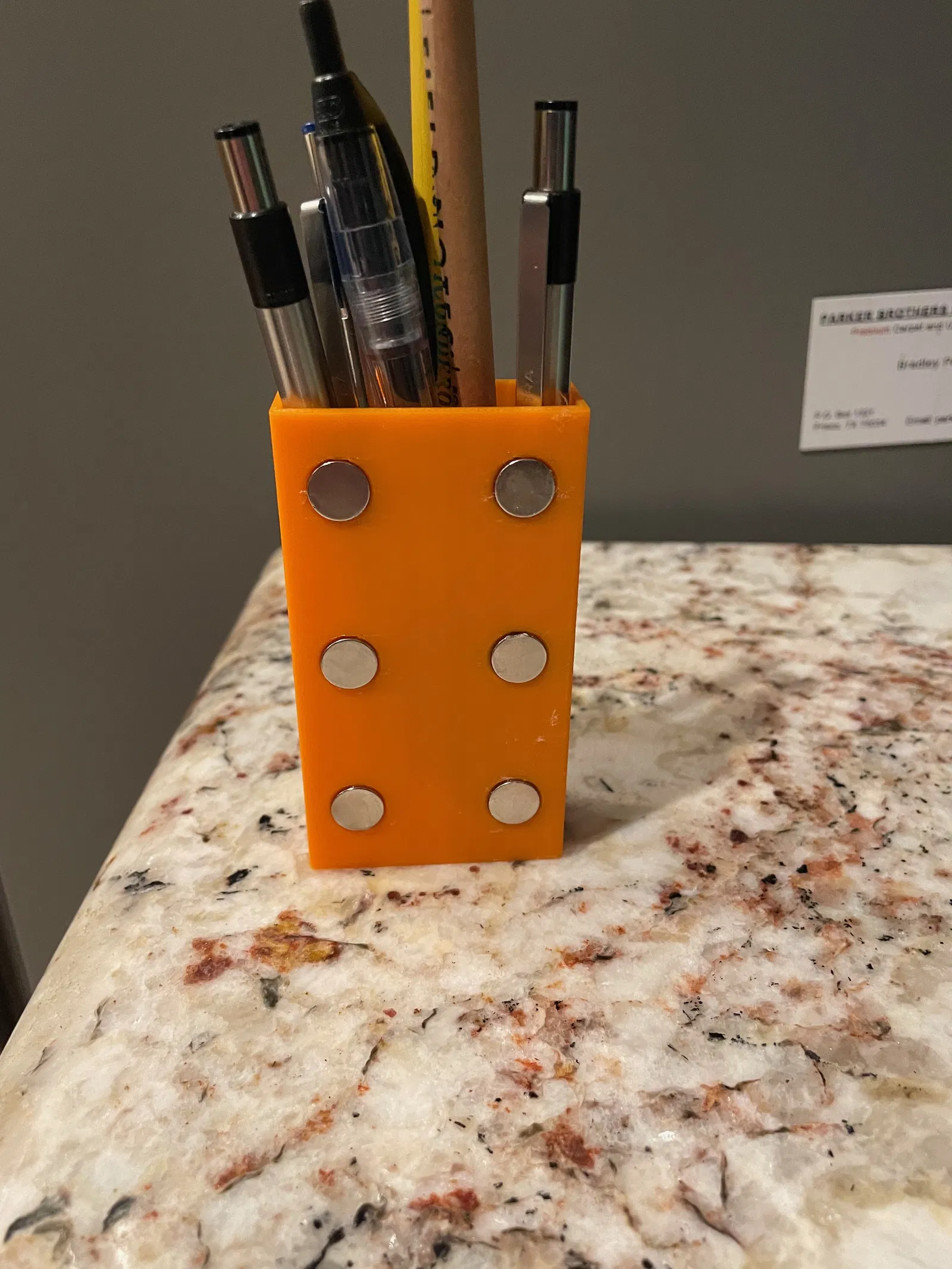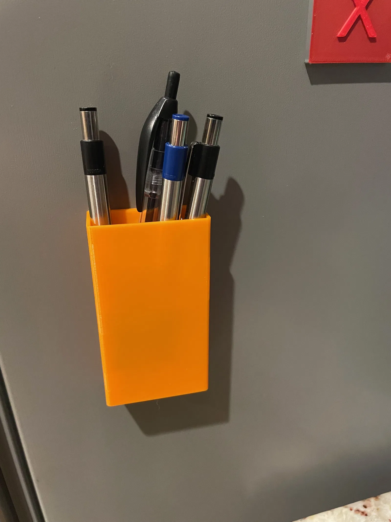 Giá đỡ bút/viết chì/dụng cụ nhỏ có thể tùy chỉnh, gắn bằng nam châm vào vật kim loại. Dễ dàng điều chỉnh kích thước và vị trí nam châm bằng Fusion 360. Thích hợp dán tủ lạnh, cửa tủ điện.