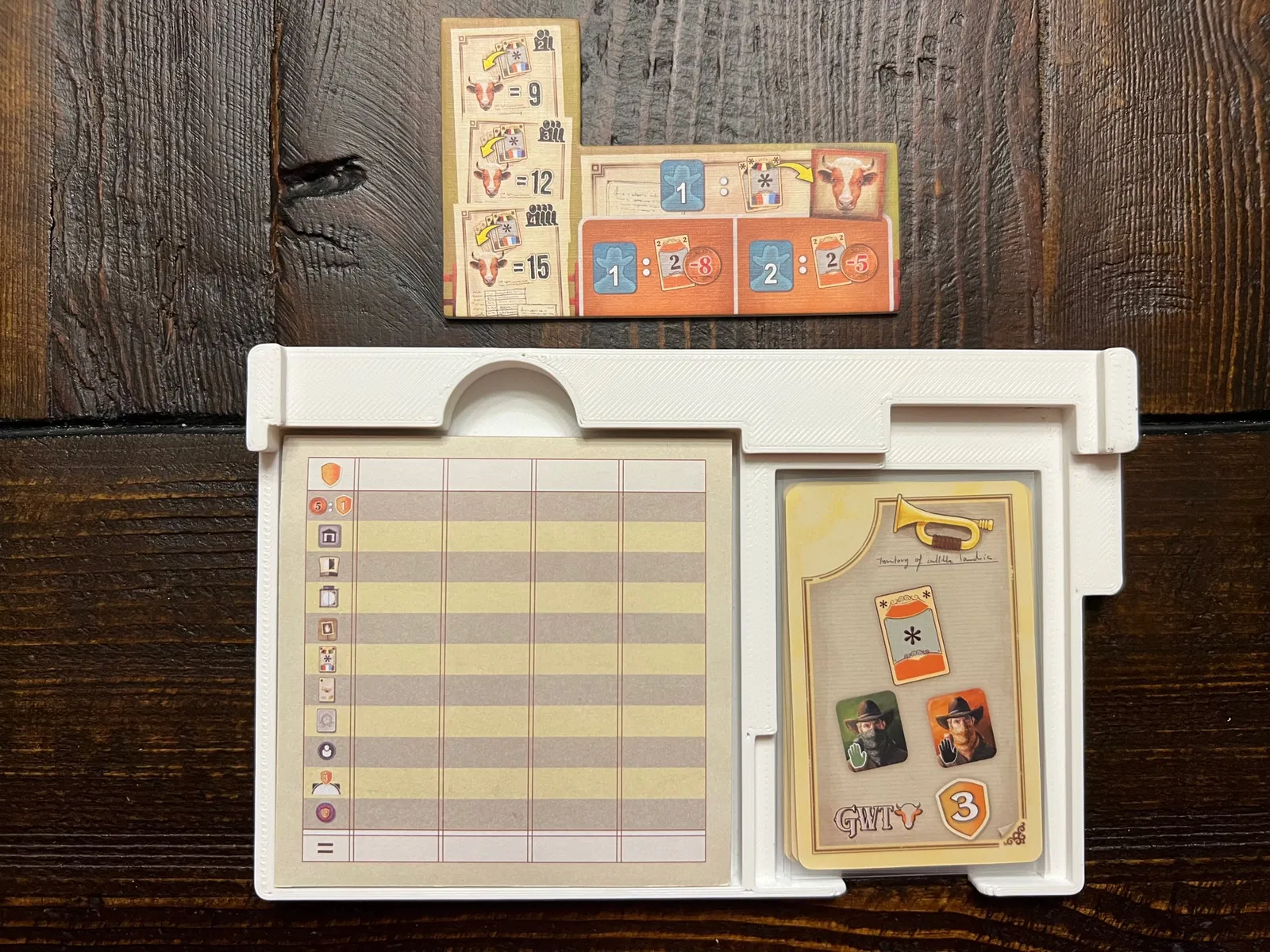 2. Một khay chứa bảng điểm, các lá bài objective khi sử dụng một trong các biến thể orange cow, và ô market màu cam; và