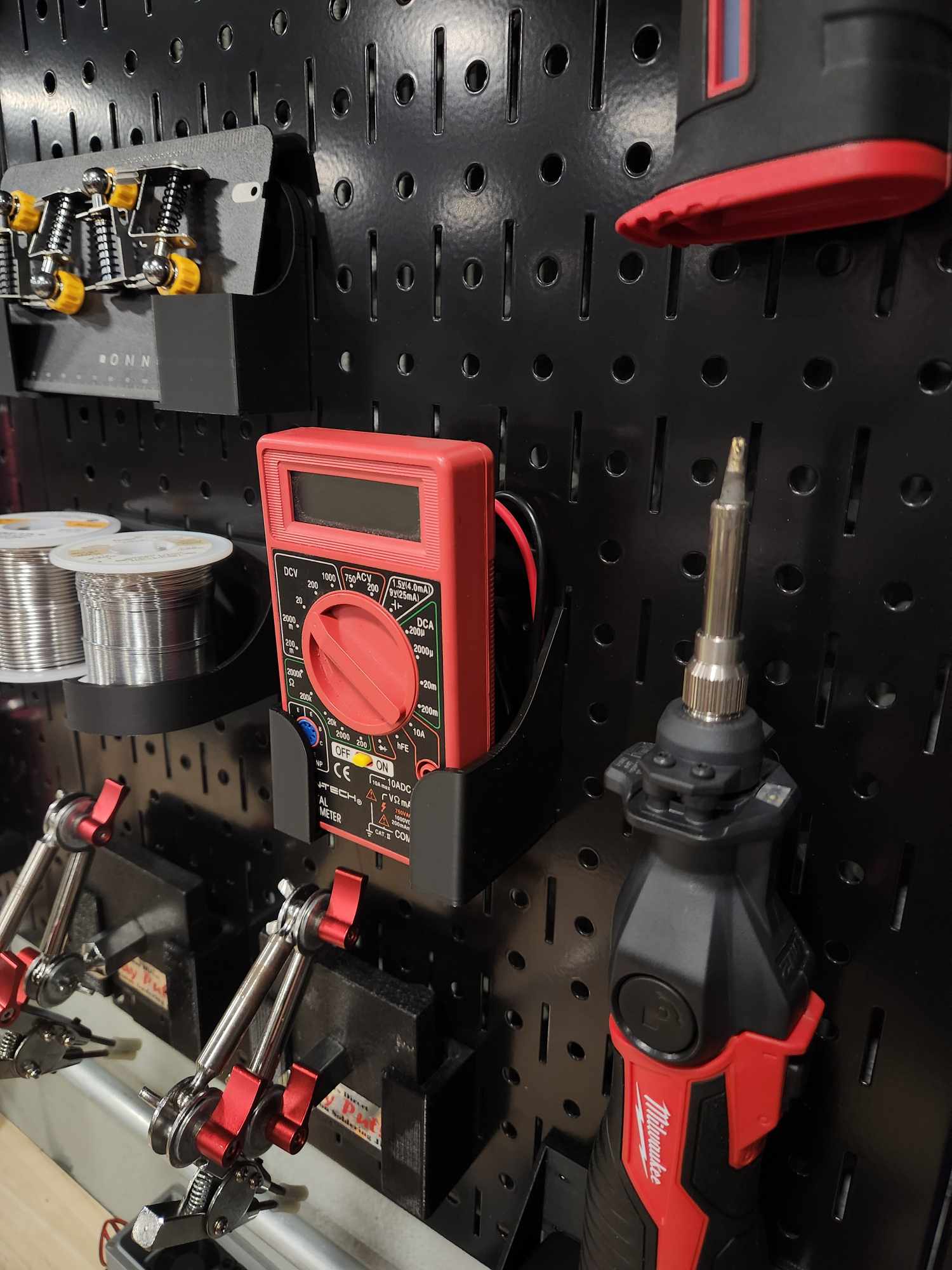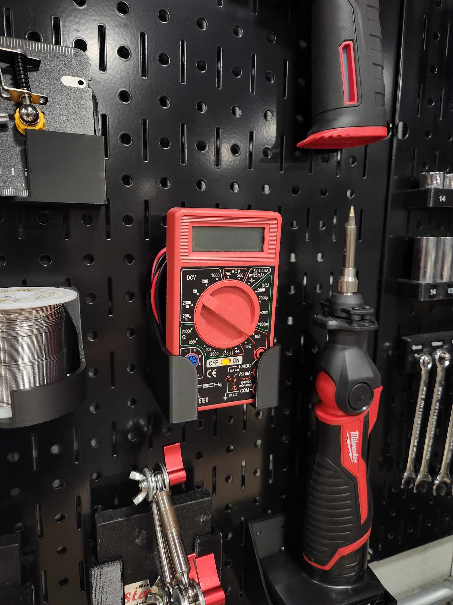 Giá treo Wall Control - Cái này gắn vừa cái đồng hồ đo đa năng Cen Tech “hàng chợ trời” của Harbor Freight có kèm dây đo. Bạn sẽ cần mấy con ốc M3 đầu bằng để gắn nó. Có thể bắt ốc từ phía sau để tạo thành cái “móc” giữ cho thiết bị gắn lên tường. Tùy chọn, bạn có thể bắt một con ốc M3 từ phía trước để cố định nó lại khi đã đặt đúng vị trí.