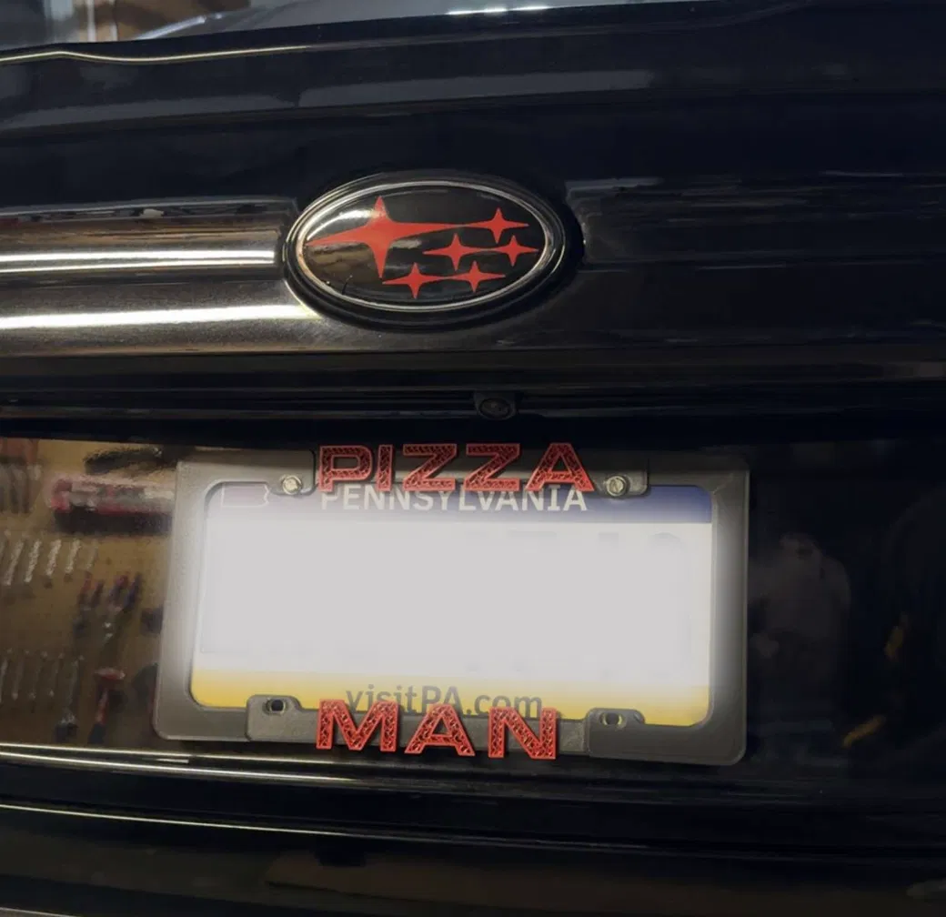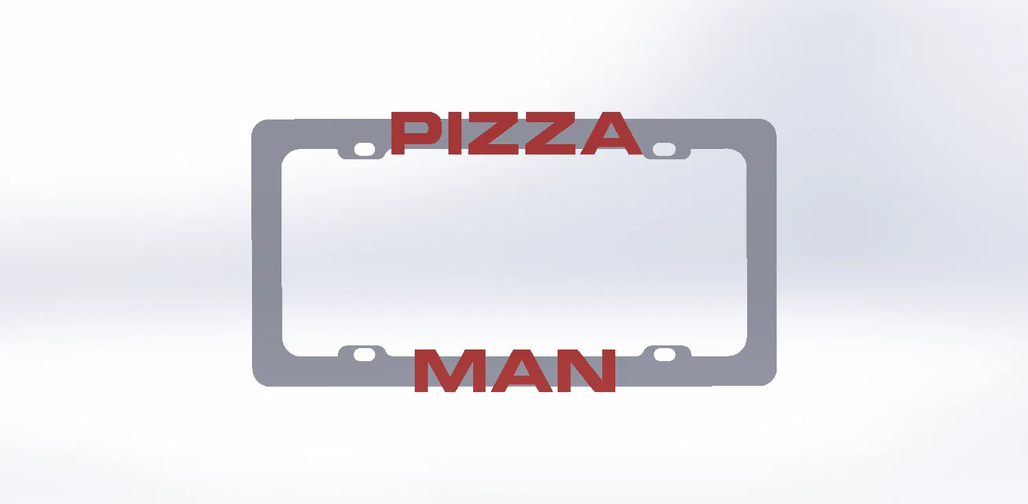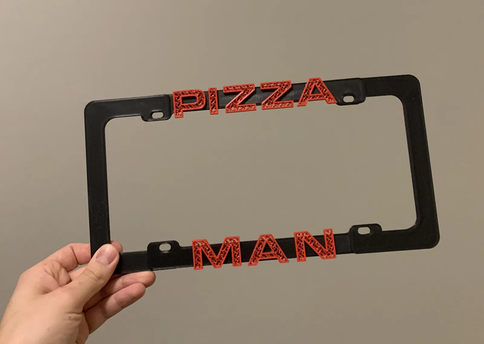 Khung biển số thiết kế theo dạng modul giúp bạn dễ dàng in trên hầu hết mọi máy in. Chữ "PIZZA MAN" là tùy chọn, in riêng và có thể dán lên khung. Bộ phận khung in 100% infill, không cần support. Chữ in 20% infill, không support.