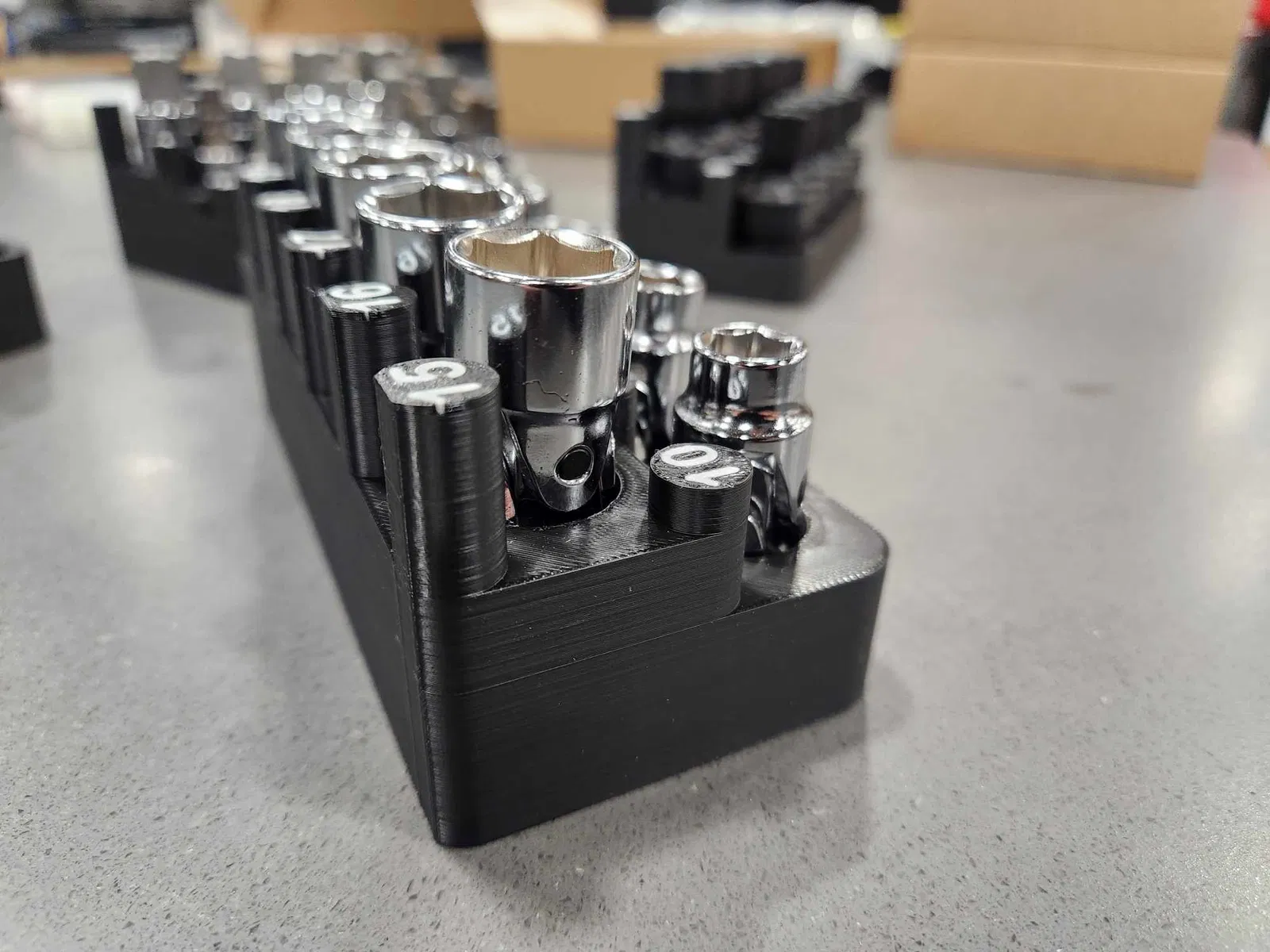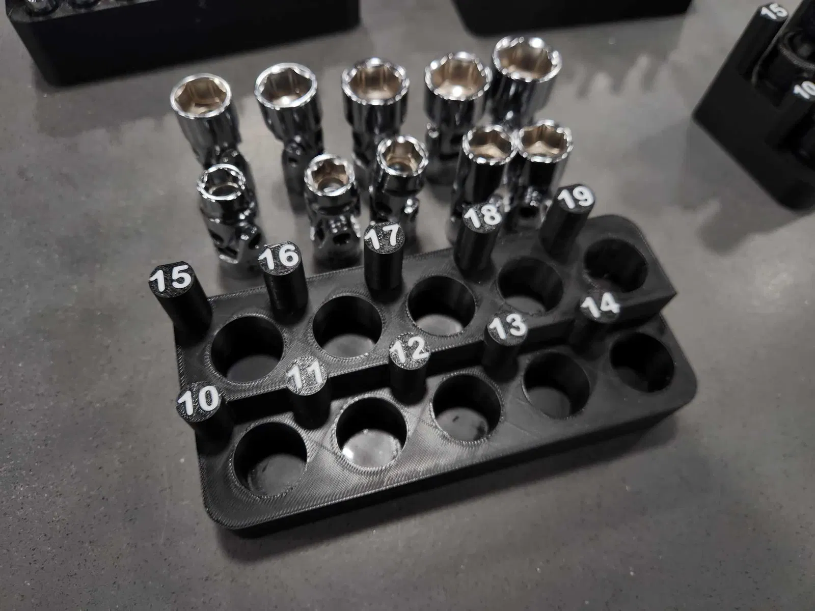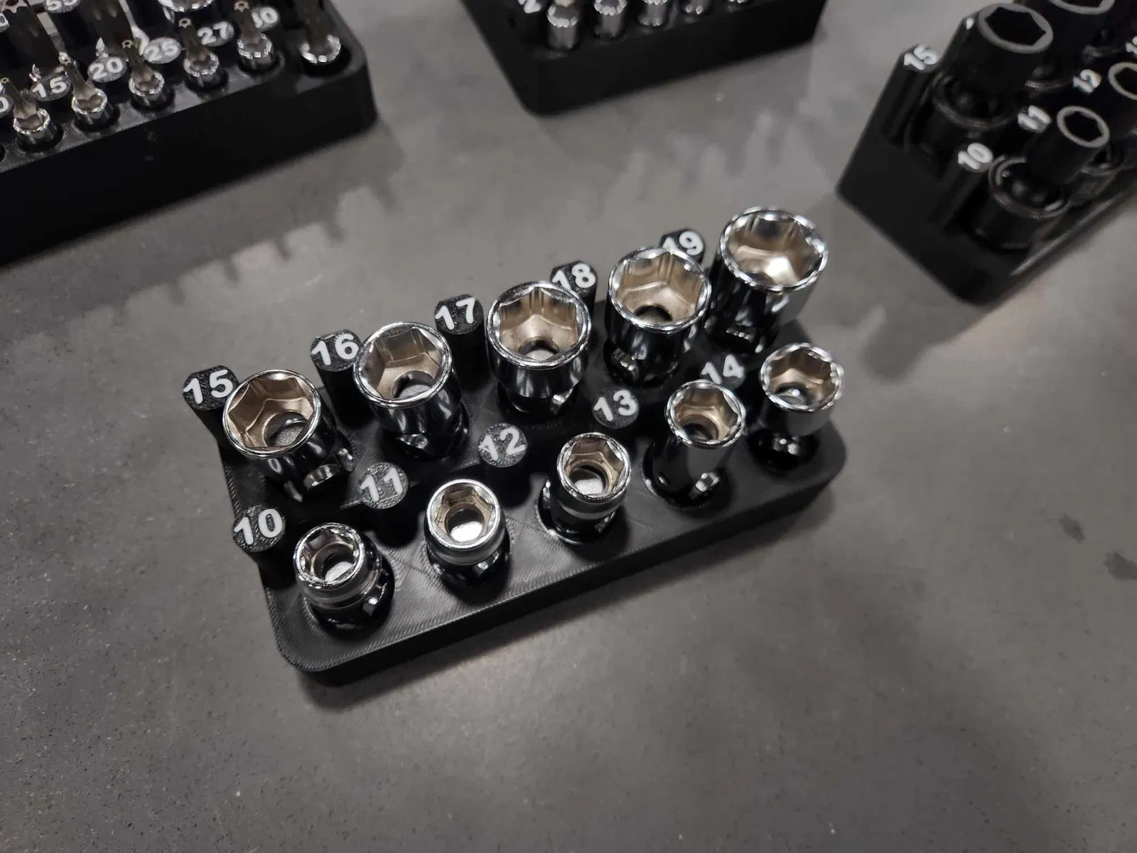Tổ chức ổ cắm tùy chỉnh có nhãn, in bằng ABS hoặc PLA. Làm riêng cho bộ ổ cắm xoay metric 3/8" của Astro Pneumatics. Giúp sắp xếp bộ dụng cụ của bạn gọn gàng.