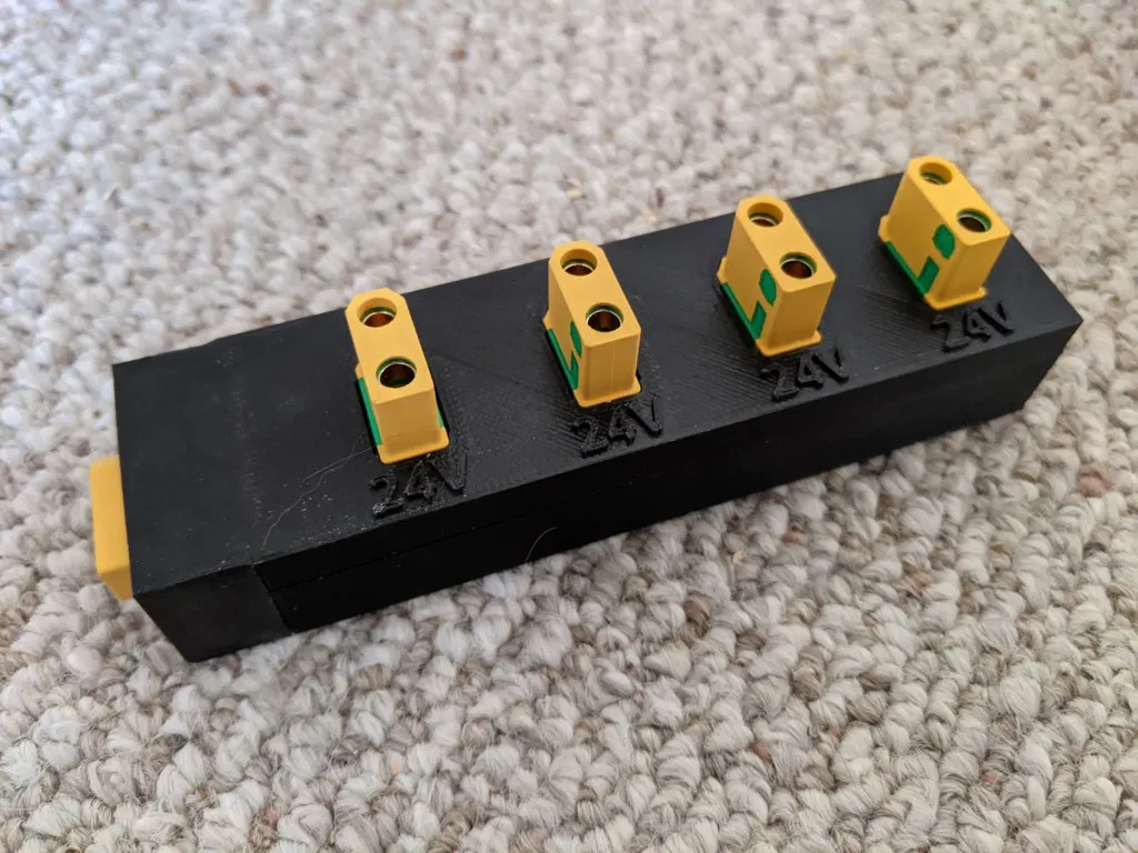 Thanh phân phối nguồn XT90 dùng cho hệ thống sạc năng lượng mặt trời 24V. Tụi em dùng jack XT90-S chống tia lửa điện thay cho jack chuối. In bằng ABS, 25% độ đặc ruột, cần ít nhất 2 lớp vỏ ngoài. Dây 10AWG hoặc 8AWG. Quan trọng là giữ nguyên vỏ silicon của dây khi hàn.