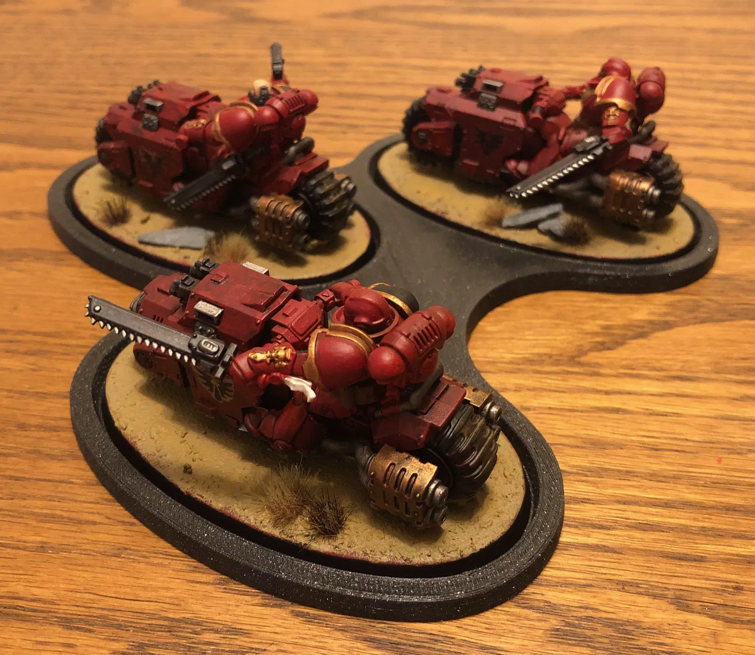 Xin chào mọi người! Đây là phiên bản đế đội hình 3 mô hình cho các tượng nhỏ hình oval 90mm của mình. Mình thiết kế cái này đặc biệt để xài chung với mấy anh lính mô tô Blood Angels của mình, nhưng rõ ràng là bạn có thể dùng với bất kỳ tượng nào trên đế oval 90mm của GW. Mình chưa thử với hãng khác nha, cho bạn biết trước.