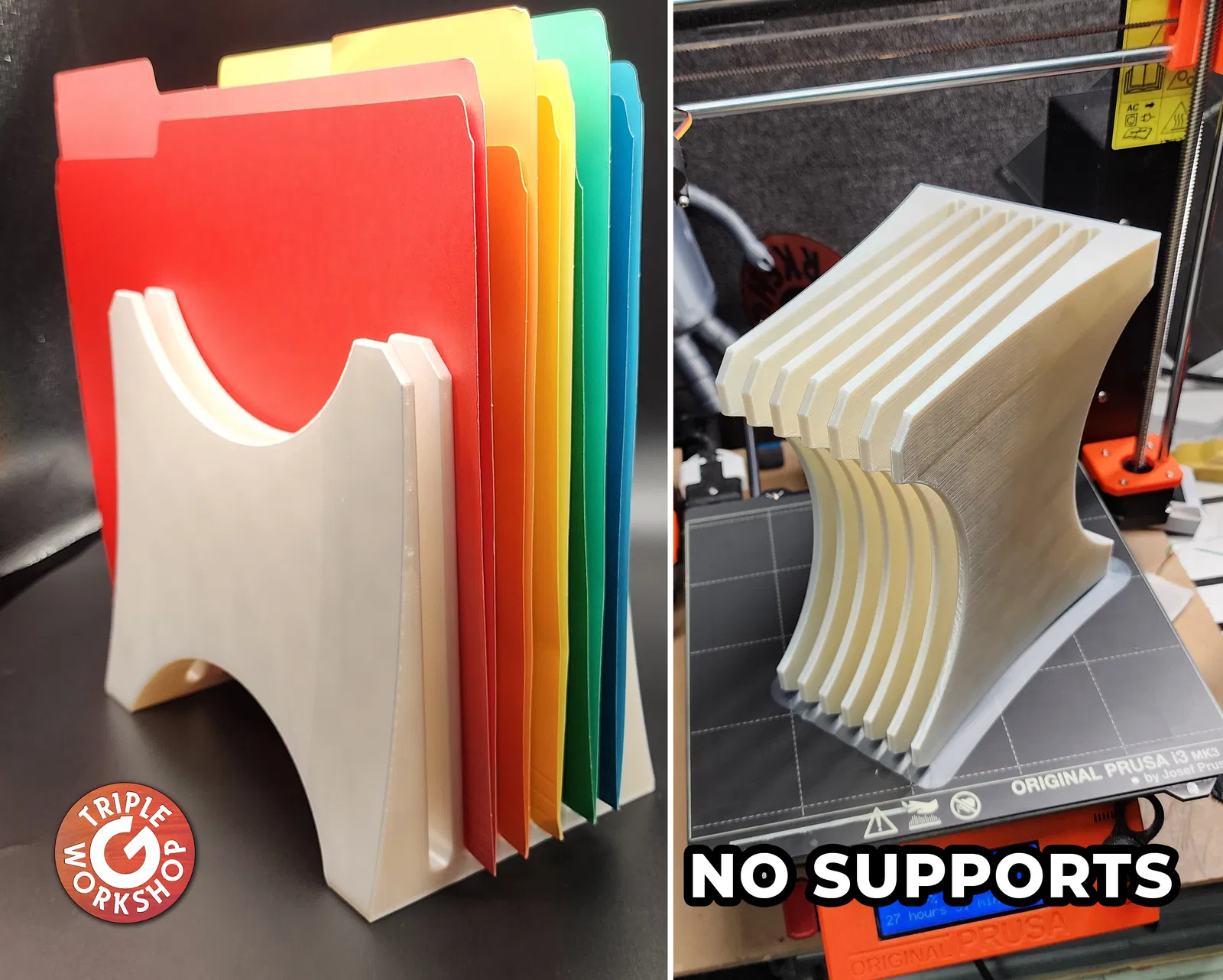 Kệ đựng hồ sơ cỡ lớn này có thể chứa tới 6 tập hồ sơ đầy và đặc biệt là in đứng mà KHÔNG CẦN SUPPORTS. Rất tiện lợi để sắp xếp giấy tờ, hồ sơ trên bàn làm việc. Khuyến khích sử dụng brim khi in để tăng độ bám dính.
