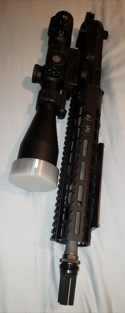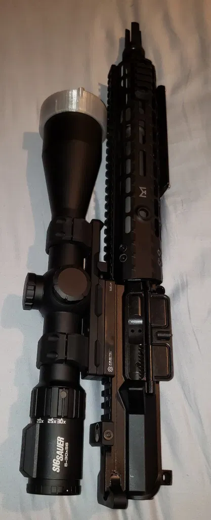 Nắp che ống kính (Lens Cover / Protector) cho Kính ngắm Súng trường Sig Sauer SIERRA6BDX 5-30X56mm. Đây là nắp che phía trước, nắp che phía sau có sẵn tại [https://www.thingiverse.com/thing:5135155](https://www.thingiverse.com/thing:5135155). In bằng TPU cho độ bền.