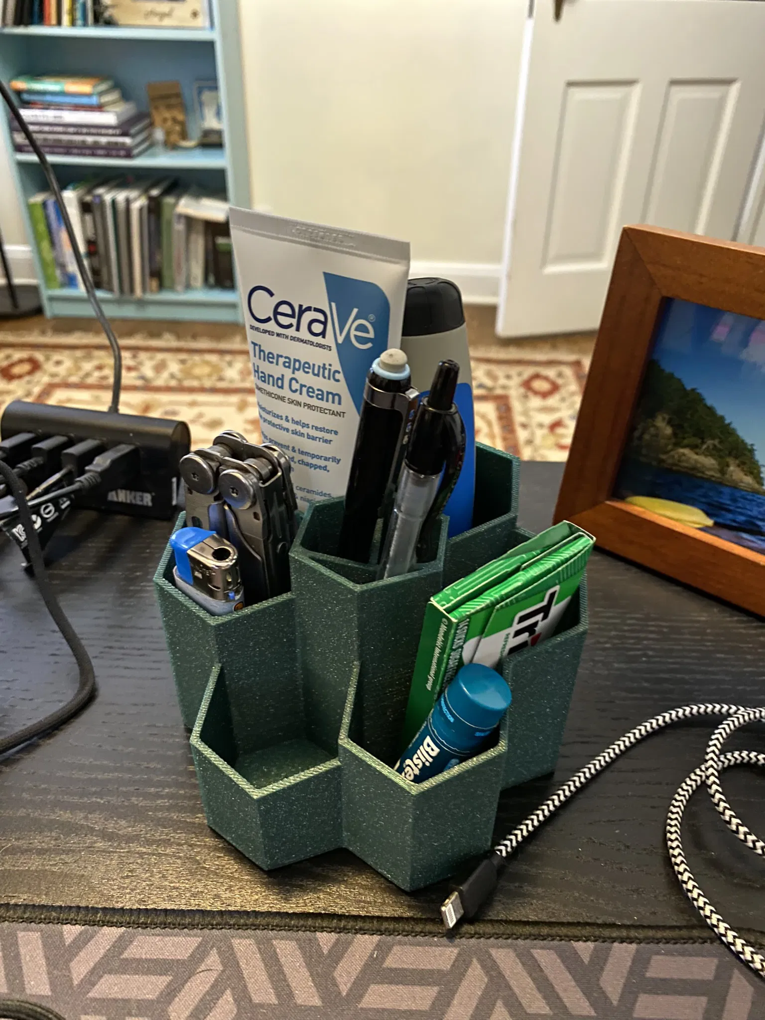 Cái kệ đựng đồ văn phòng dạng tổ ong này có thể chứa đủ thứ bút, viết chì, kéo, dụng cụ, hoặc mấy món đồ linh tinh khác trên bàn với nhiều kích cỡ túi khác nhau. In một mảnh, không cần hỗ trợ (supports). Tuyệt vời để giữ cho bàn làm việc của bạn gọn gàng và có tổ chức.