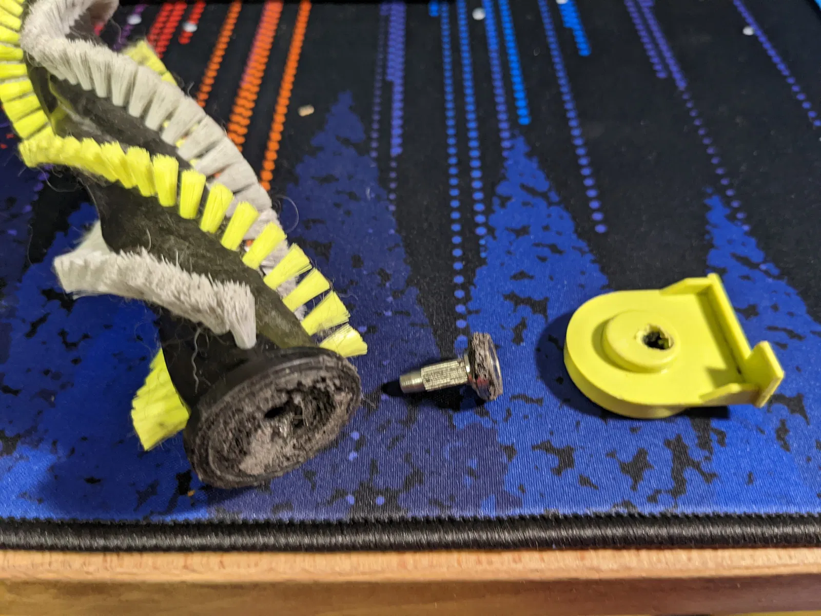 Lấy trục vòng bi ra, thay thế vòng bi cũ bằng cái mới, sau đó chà nhám phẳng thanh chổi, gắn lại trục vào bằng keo epoxy và ép chặt mọi thứ lại với nhau. Vòng bi không bị dính quá chặt đâu, tôi đã có thể tách nó ra khỏi trục bằng một cây đục móng tay.
