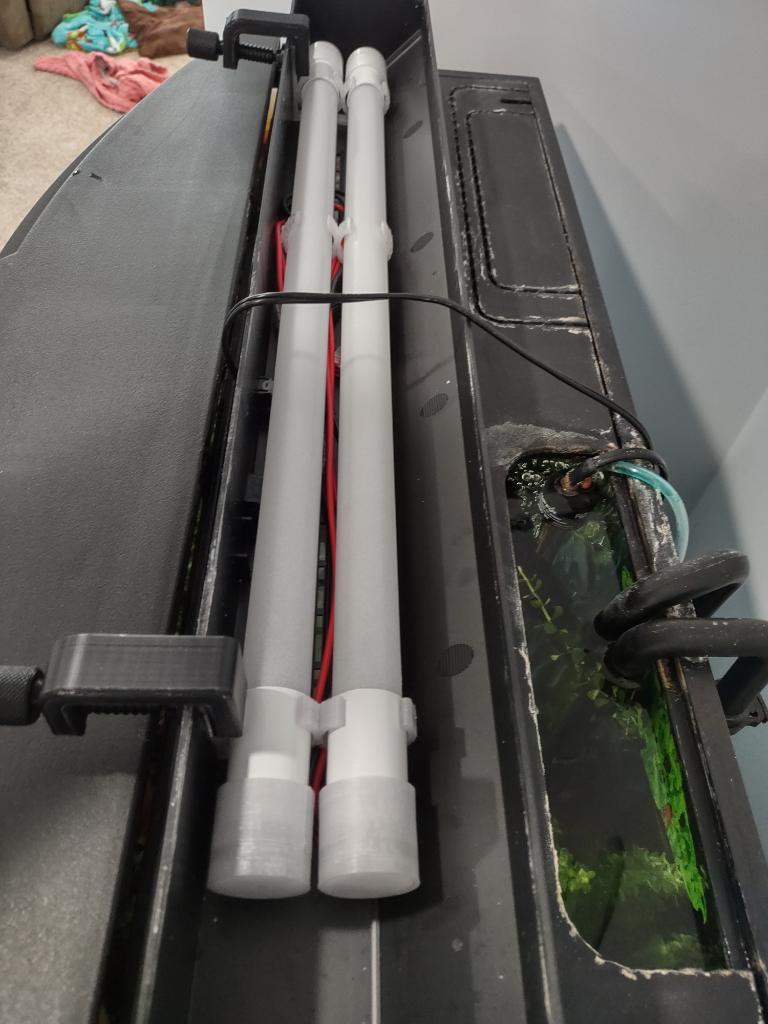 Chuyển đổi đèn mui bể cá huỳnh quang để chứa 2 bóng đèn LED thay thế. Cần đấu dây một chút. Sử dụng bóng đèn "có nguồn ở một đầu" và hàn dây vào các cọc. Luồn dây qua nắp cuối và lắp các nắp để che đầu ống. Cài đặt in: Không cần vỉ nướng, không cần hỗ trợ, lưới điền 100%. Chất liệu PETG.
