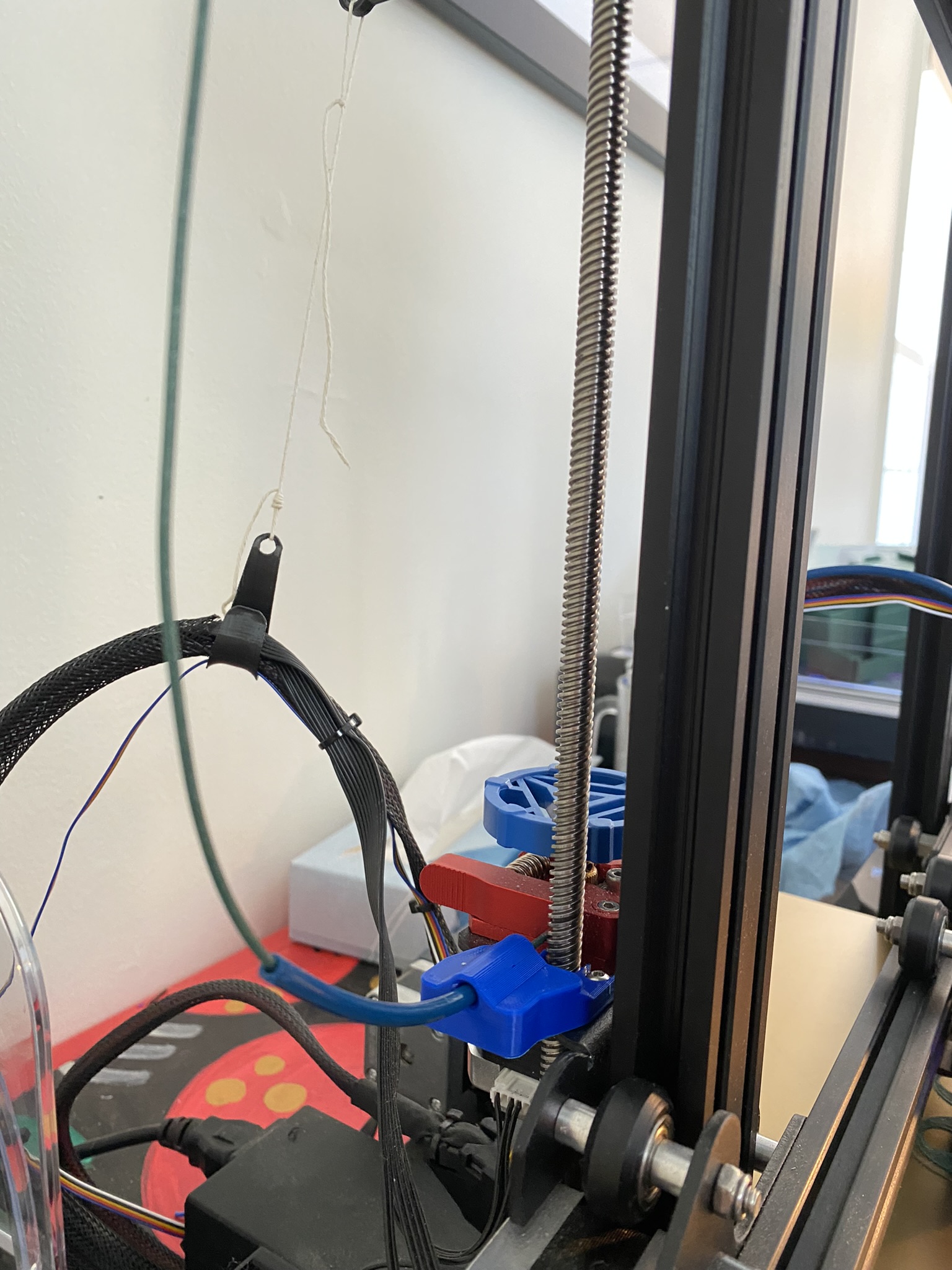 Cái này tui làm không có bộ phận chuyển động nào hết: chỉ dùng một đoạn dây Bowden ống PTFE ngắn để dẫn dây tóc vô chỗ ép đùn mà không bị kẹt hay nghiến. Cái ống dẻo này xài ổn hết, dù để cuộn dây ở trên hay bên hông máy cũng được.