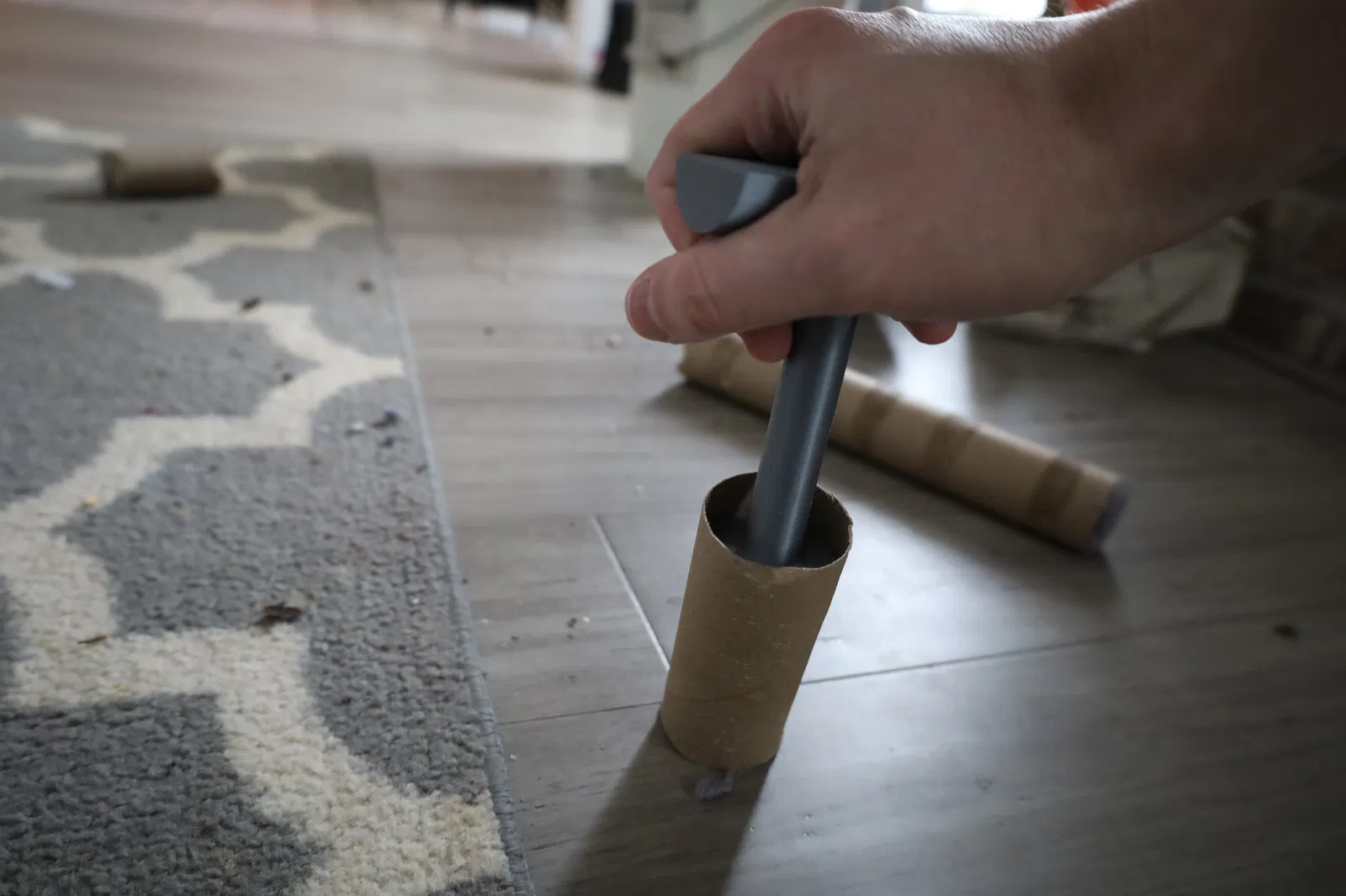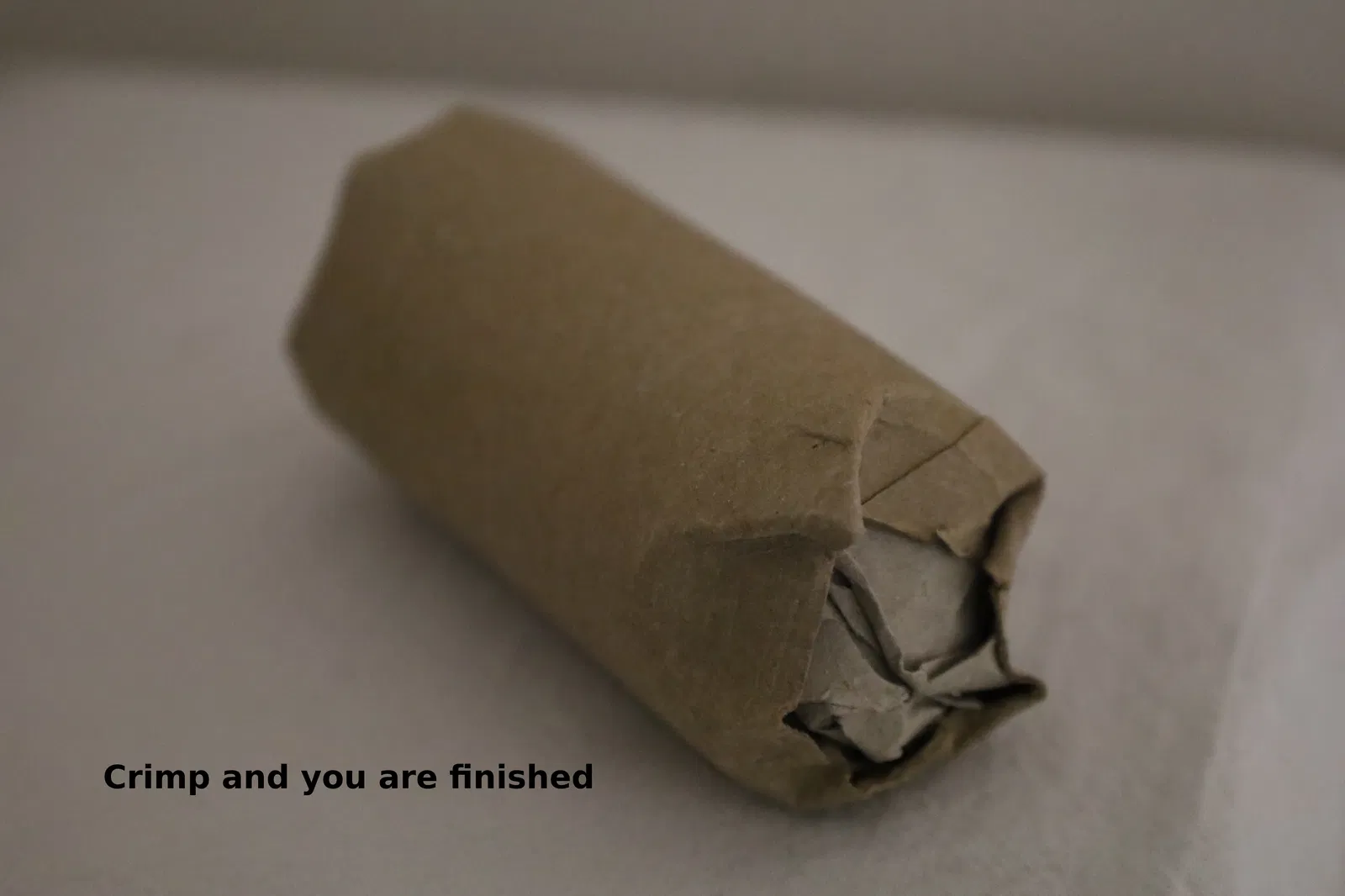 Mình làm mấy cái bùi nhùi bắt lửa từ giấy carton bỏ đi và mấy vật liệu thải loại khác như giấy gói, bông sấy khô, bã nến dư, và mùn cưa. Đây là cái dụng cụ để nén mấy thứ đó vô ống carton.