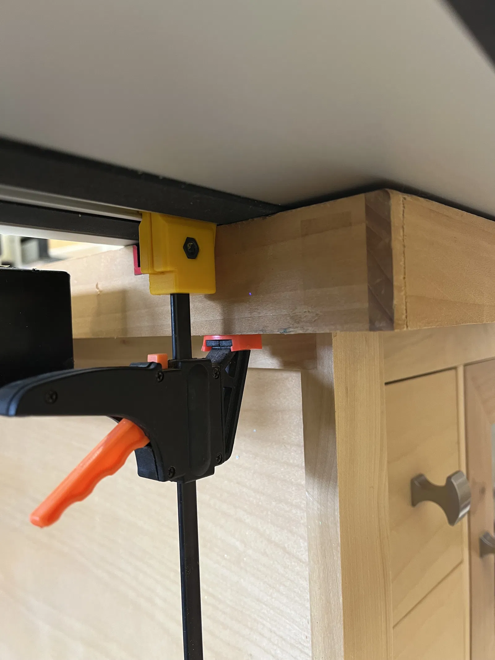 Cái đầu kẹp ray cưa rãnh TlustejHanz cho ray cưa rãnh xài ngon lắm. Tui có mấy cái kẹp hiệu Harbor Freight mà nhìn giống cái hiệu Parkside mà mẫu gốc xài á, đúng y chang là cái thanh kẹp nó có kích thước y chang luôn. Mẫu gốc thì hình như để thay con ốc zin luôn, nhưng mà tui muốn xài con ốc vặn của cái kẹp zin, mà khổ cái là con ốc đó nó không đủ dài để tới được cái con tán trong cái mẫu thiết kế gốc. Với lại, cái mẫu gốc nó cần phải có đế đỡ tại vì nó có một cái phần bị nhô ra mà không có gì đỡ hết.