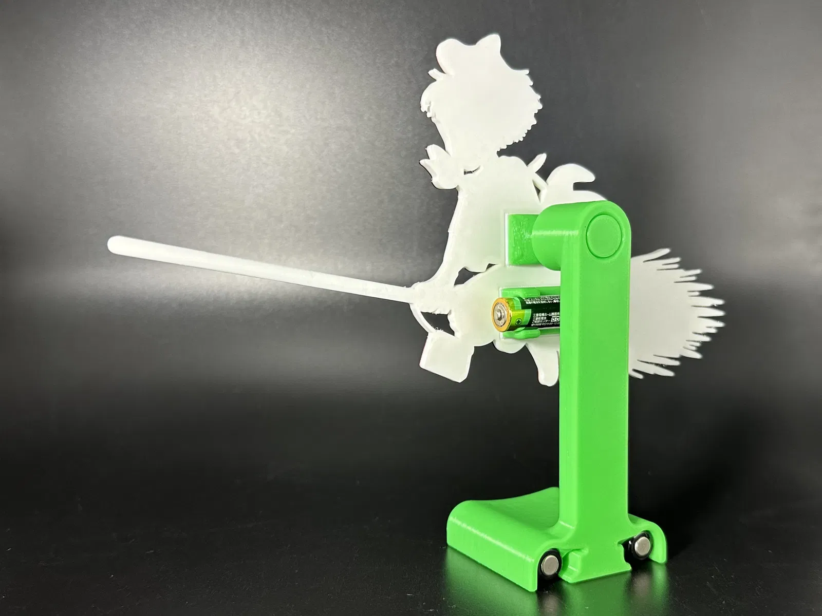 In 4 màu, in đa sắc Kiki's Delivery Service. Bập bênh bằng 3 viên pin AAA đã qua sử dụng làm đối trọng. Sử dụng băng keo hai mặt hoặc keo dán để ghép các bộ phận. Xịt chút dầu bôi trơn vào trục xoay sẽ giúp nó quay mượt hơn.