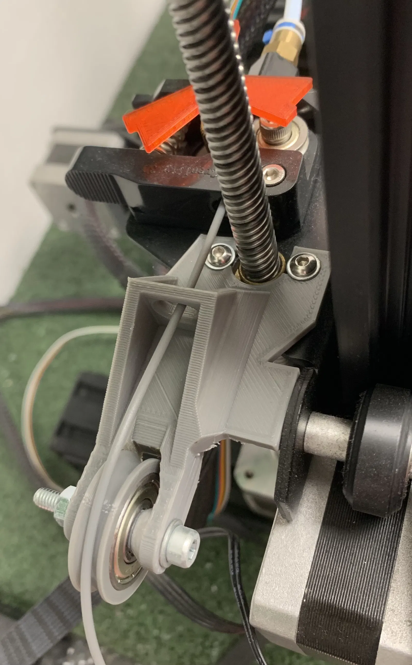 Đây là một bracket dẫn dây tóc cho Ender 3, nếu bạn muốn di chuyển cuộn dây tóc ra khỏi đỉnh máy in. Nó dẫn dây tóc từ bên cạnh hoặc dưới đáy máy in bằng vòng bi con lăn. Cái này giúp tui giảm rung động và lắc lư trong quá trình in ấn rất nhiều. Có thể gắn trên đỉnh bộ đùn bằng ốc zin của máy.