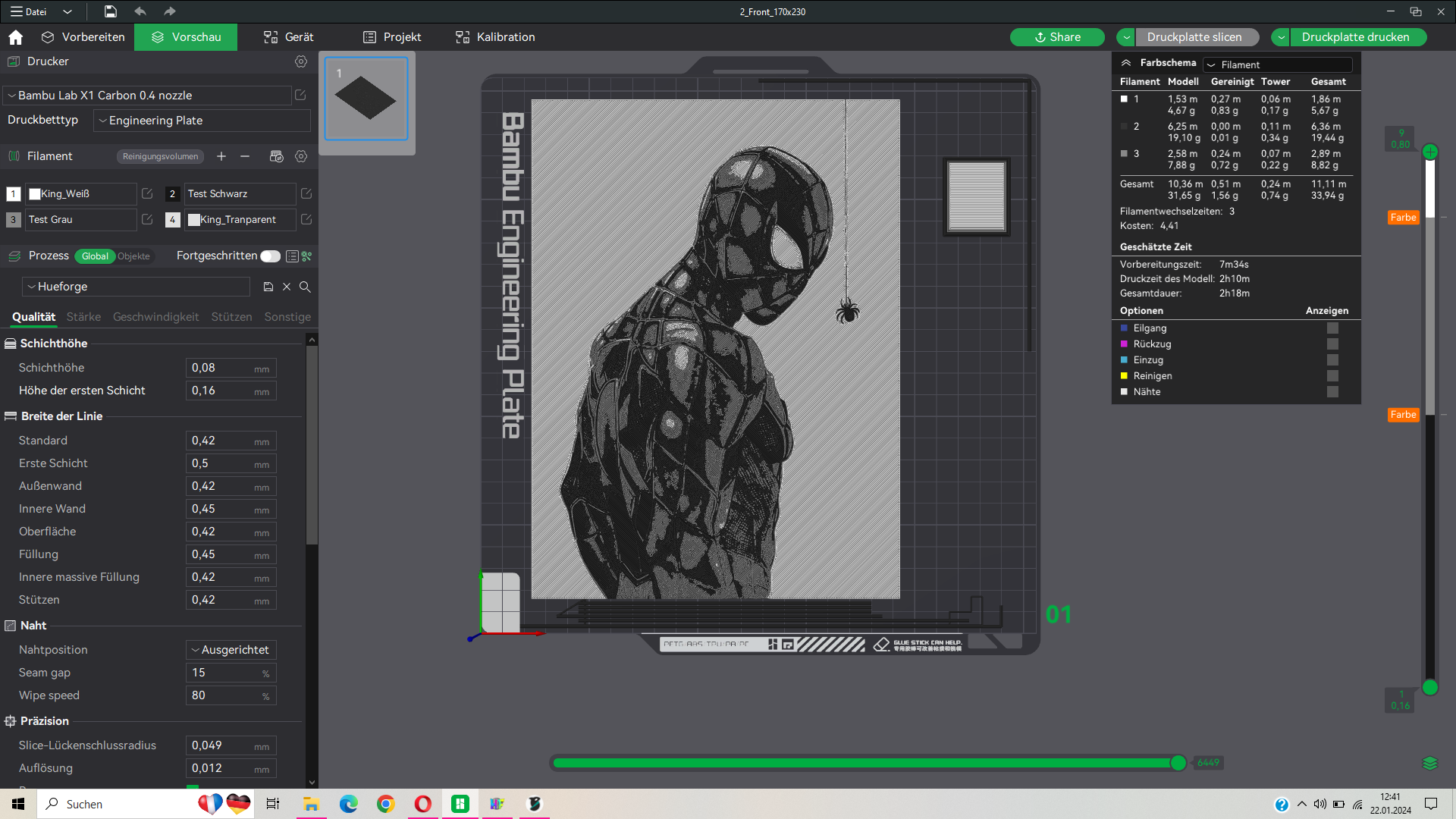 In mô hình Spider Man Hueforge với các thông số chi tiết. Hướng dẫn sử dụng filament PETG JAYO Black, GEETECH Gray, JAYO White với khoảng cách truyền lần lượt là 0.3, 3, và 6. Các bước đổi màu được thực hiện tại lớp 5 và 8, chuyển sang màu White cho phần còn lại của mô hình.