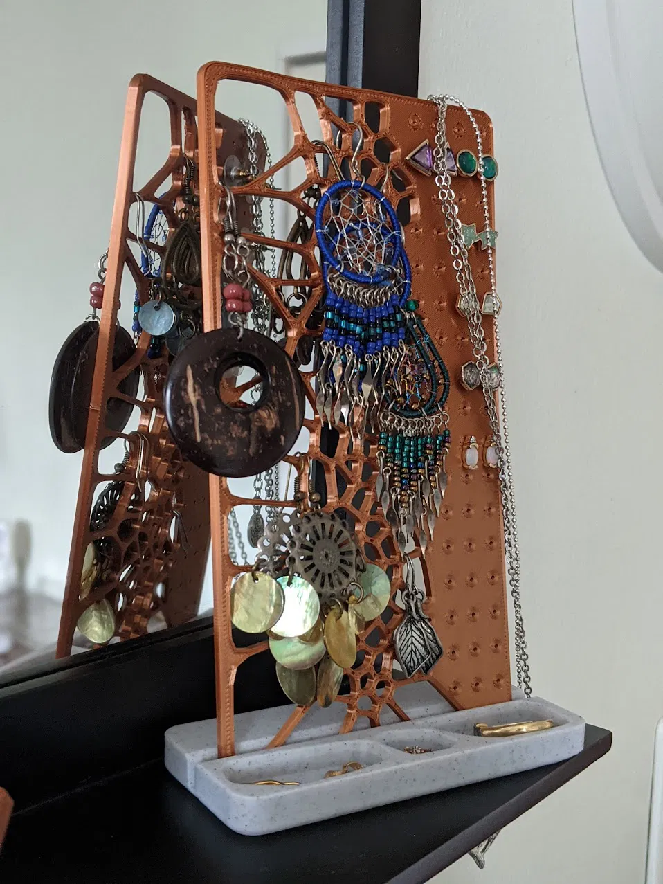 Tui dùng 50% infill cho cái đế để nó nặng hơn tí, mà tới giờ xài thì thấy cũng không có xi-tê gì vụ lật đâu. Tuy nhiên, tùy thuộc vào số lượng và độ nặng của đồ trang sức mà bạn để lên stand thì có thể khác nha.