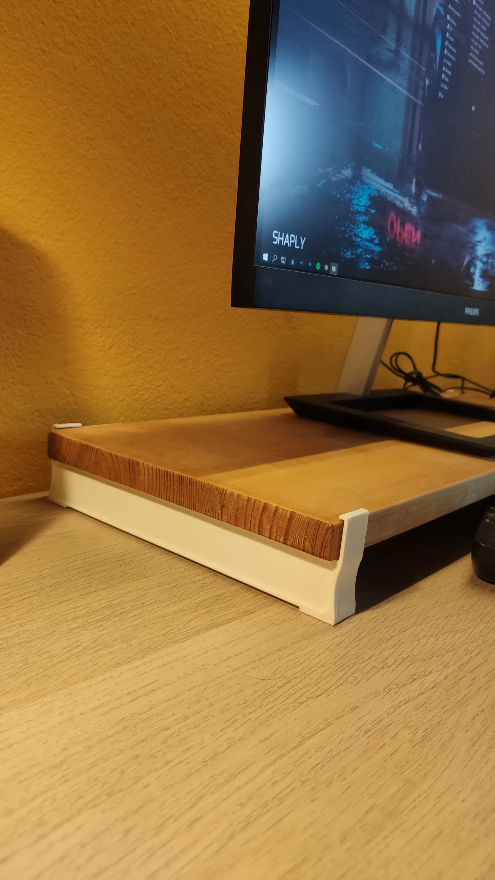 Cái chân đế màn hình này gồm hai phần in 3D (chân) và một tấm ván gỗ, bạn có thể giấu bàn phím ở dưới đó để bàn làm việc của mình gọn gàng hơn. Thông số: độ dày ván 20mm, chiều dài ván tùy ý, chiều cao chân đế 30mm hoặc 40mm.