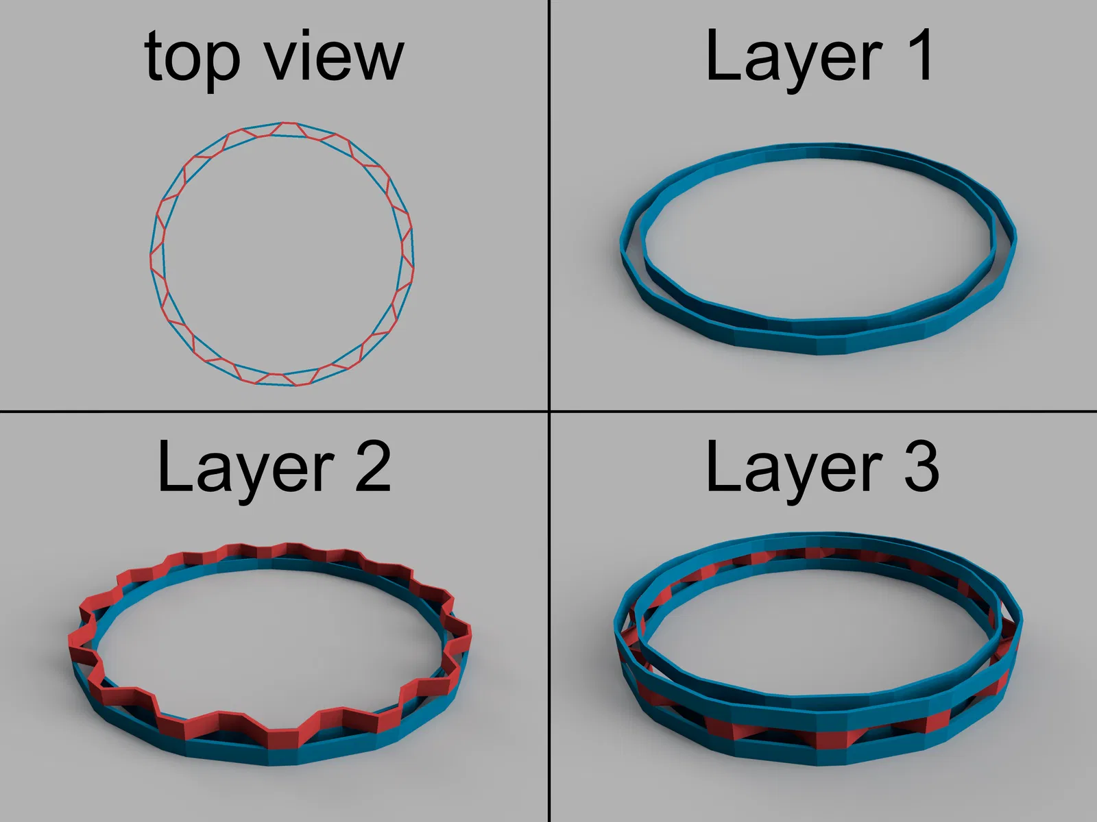 Không khí vẫn có thể lưu thông qua các khe hở giữa các lớp và thiết kế zigzag tạo ra một bức tường rất chắc chắn ngay cả khi thành chỉ được làm từ một đường đùn duy nhất, ở điểm yếu nhất.