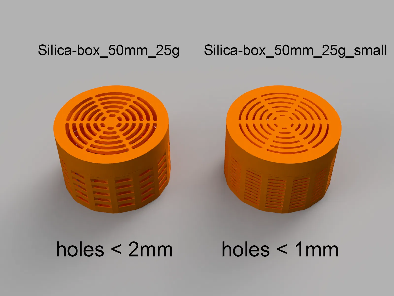 Lỗ của phiên bản thường có kích thước 2mm. Kích thước này đủ nhỏ cho các hạt Silica gel thông thường ngoại trừ những hạt bị vỡ. Vì lý do đó, tôi đã tạo ra một phiên bản có lỗ với kích thước tối đa 1mm cho mỗi hộp. Điều này sẽ giữ lại hầu hết các hạt bị vỡ bên trong hộp.