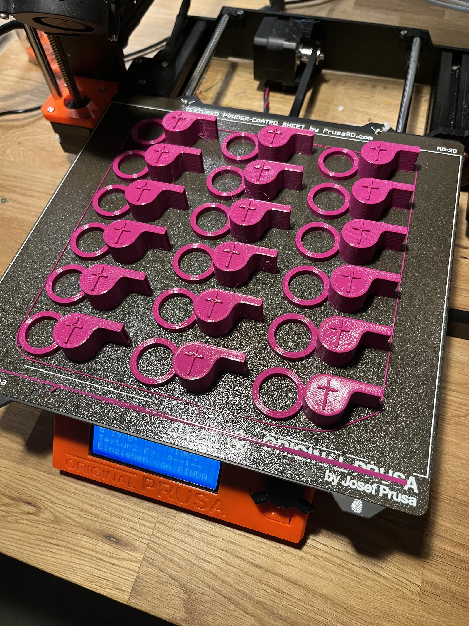Một cái còi hữu ích dựa trên mẫu gốc của Prusa. Với một cái vòng nhỏ mà bạn có thể đeo vào ngón trỏ trái hoặc phải, bạn sẽ được trang bị đầy đủ cho buổi biểu tình tiếp theo chống lại chủ nghĩa phát xít. Vì tôi làm việc trong nhà thờ, nên có một cây thánh giá làm logo.