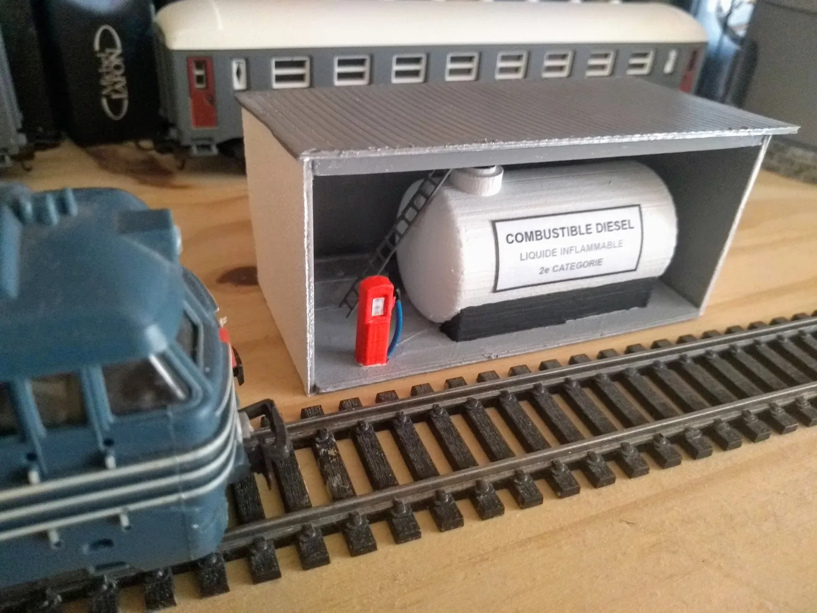 Trạm tiếp nhiên liệu diesel tỷ lệ HO cho mô hình đường sắt, có thể in bằng máy in sợi nhựa FDM. Mô hình bao gồm thang và nhà kho nhỏ. Thích hợp cho người yêu thích mô hình đường sắt.