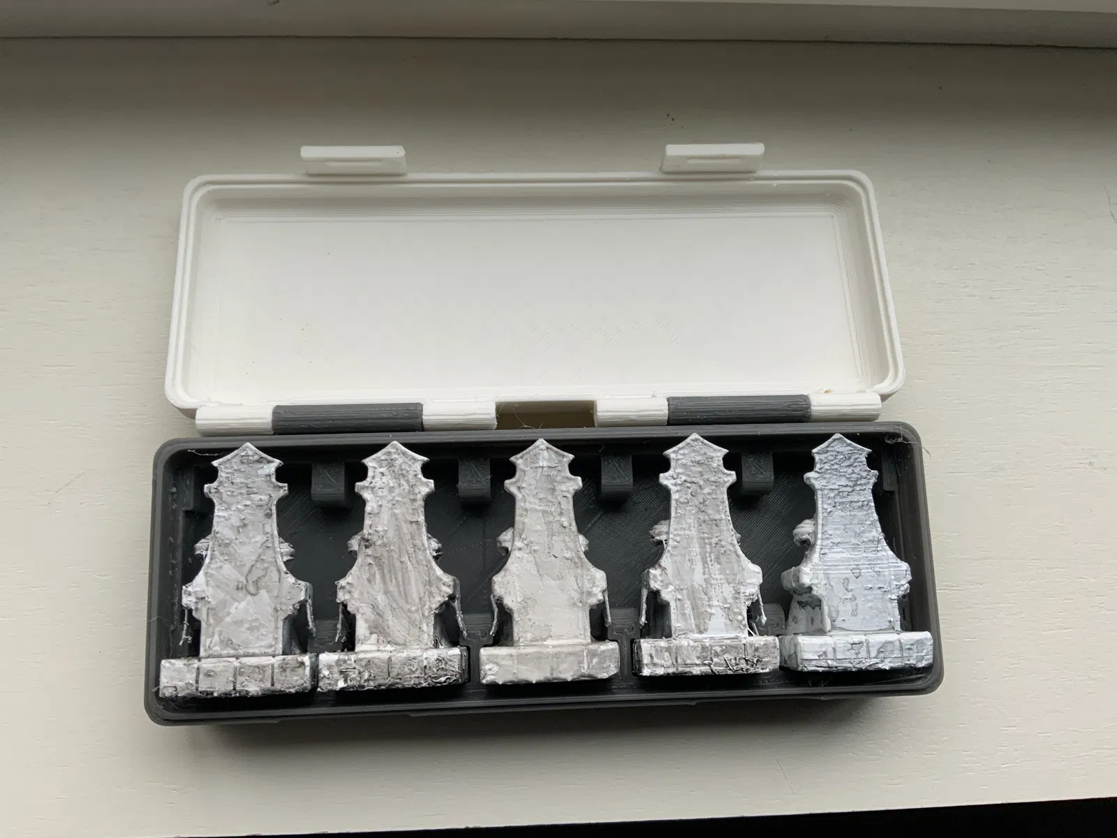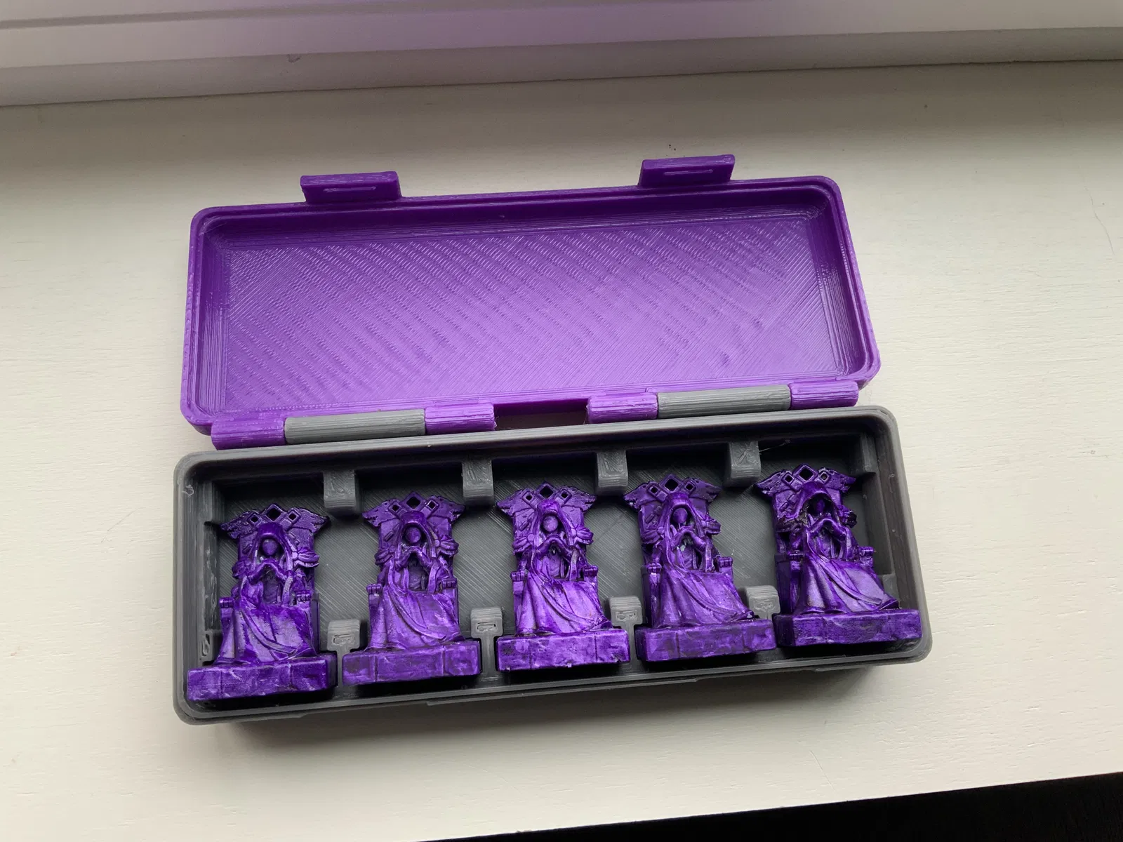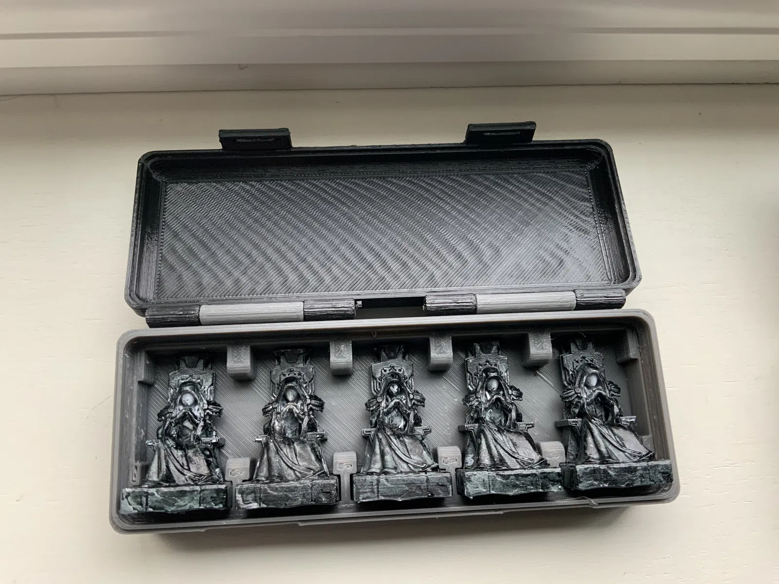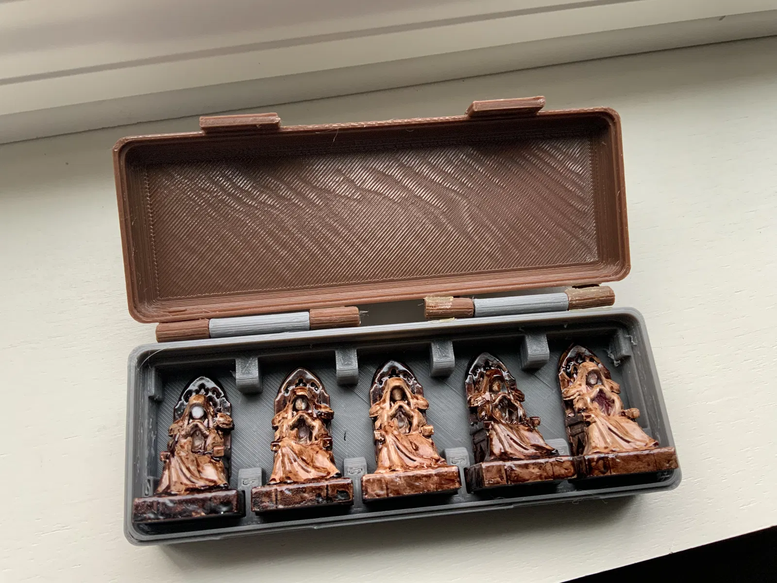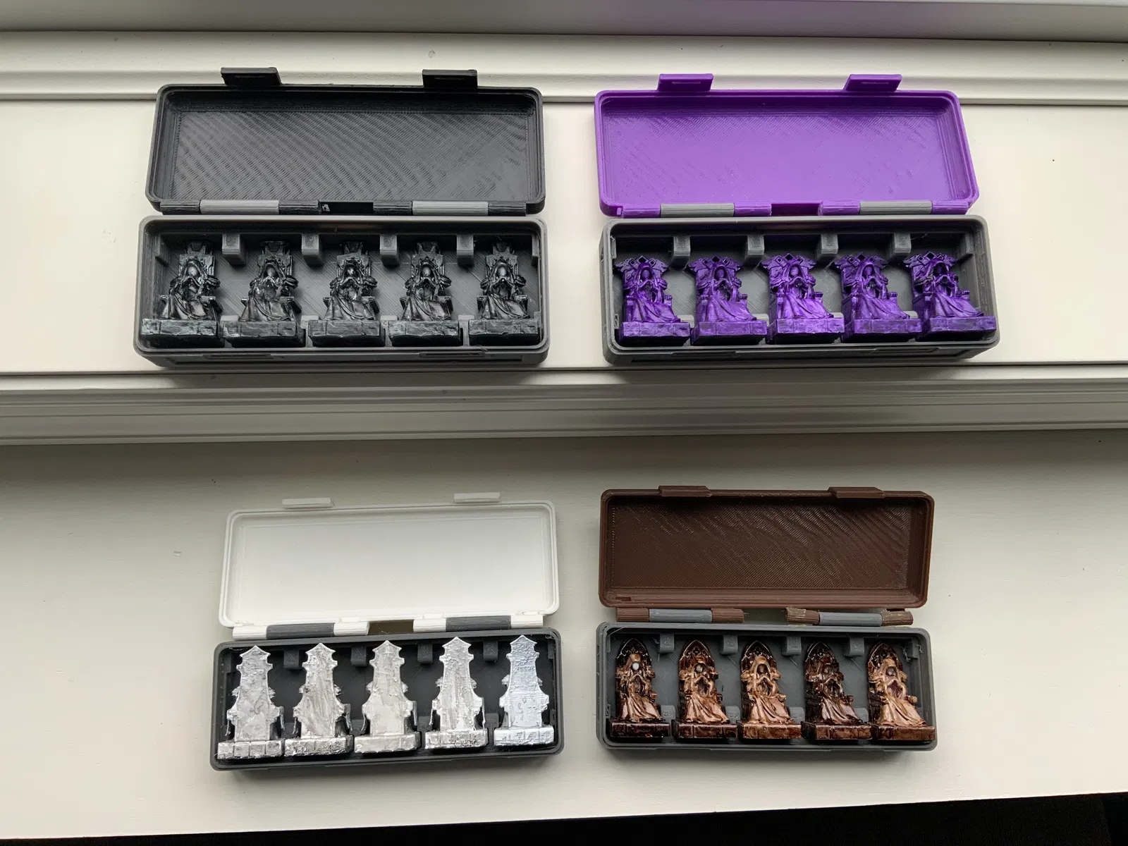 Bộ 4 hộp đựng quân cờ đại diện cho trò chơi board game "War of Whispers". Mỗi hộp có nắp với con dấu riêng biệt của từng phe, do ac15d thiết kế. Một số quân cờ có thể cần đặt úp để vừa vặn.