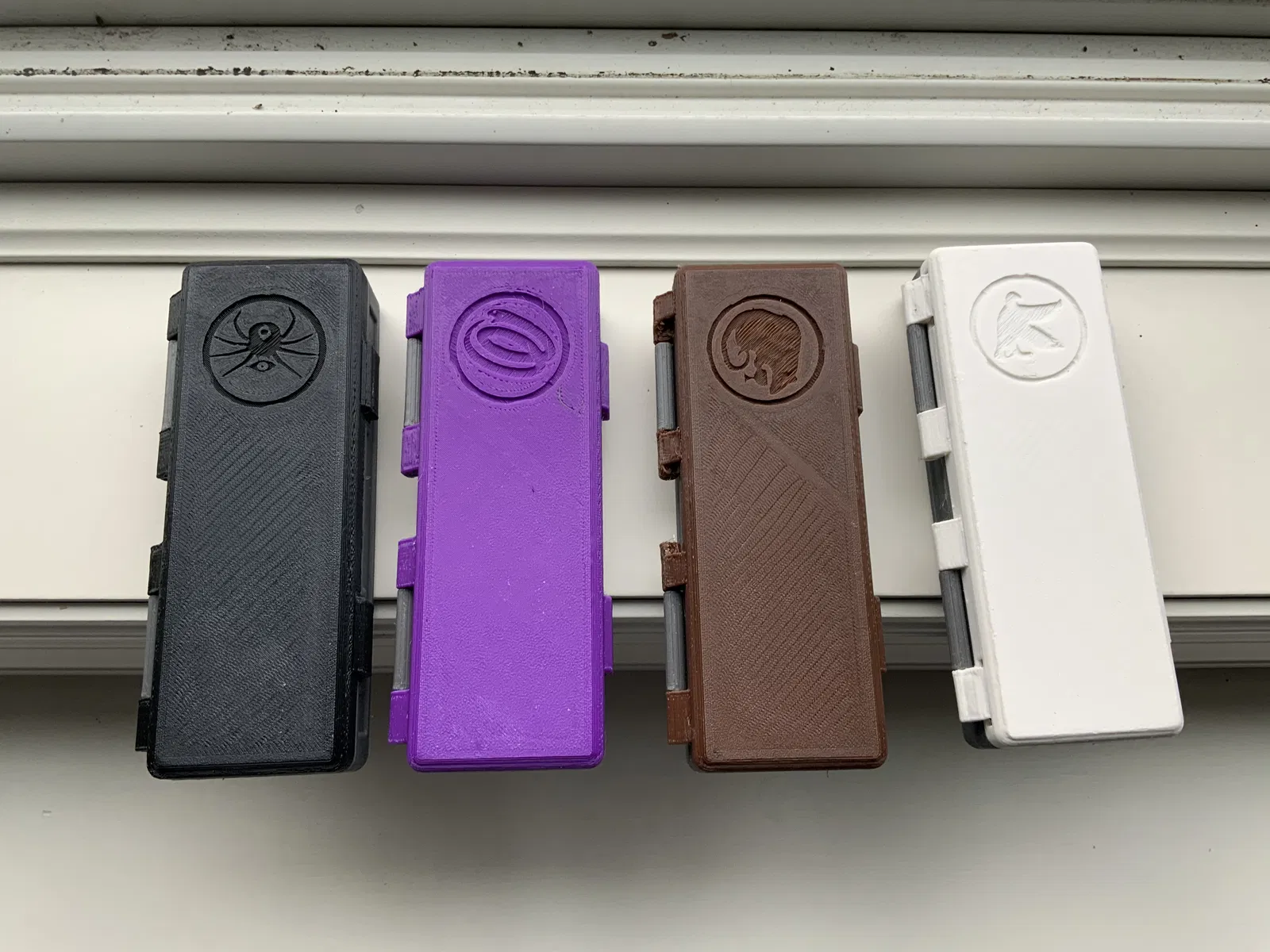 Bốn cái hộp này dùng để đựng các quân cờ đại diện (agent marker) xinh đẹp của ac15d cho trò chơi board game War of Whispers. Mỗi nắp hộp có một con dấu độc đáo của mỗi phe phái (cũng xin ghi nhận công lao của ac15d cho phần thiết kế con dấu này).