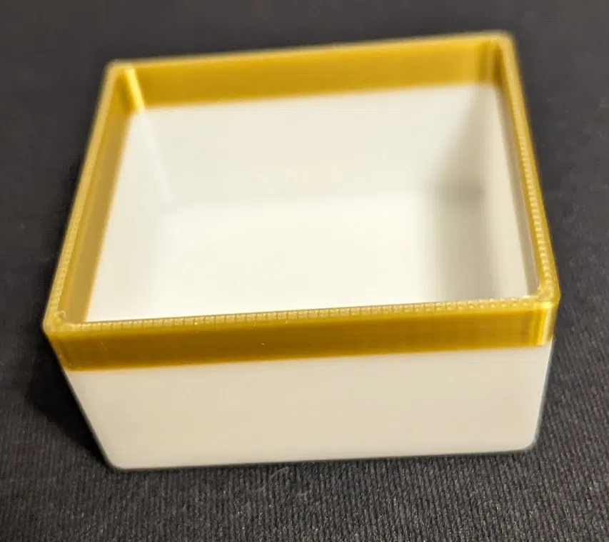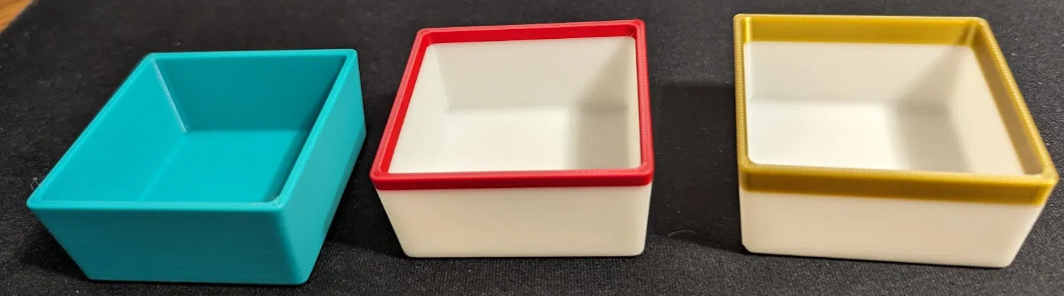 Chiếc Khay Đơn Giản này là một trong những món đầu tiên tui từng in. Tui đã in nhiều cái khay này trong năm qua. Mới tuần trước, tui lỡ hết dây tóc nên phải in dở bằng màu khác, mà nhìn cũng ổn áp nên tui thử nghiệm in hai màu. Tui thấy dùng màu tương phản cho 6mm lớp trên cùng sẽ làm cái khay đơn giản này nổi bật hơn hẳn.