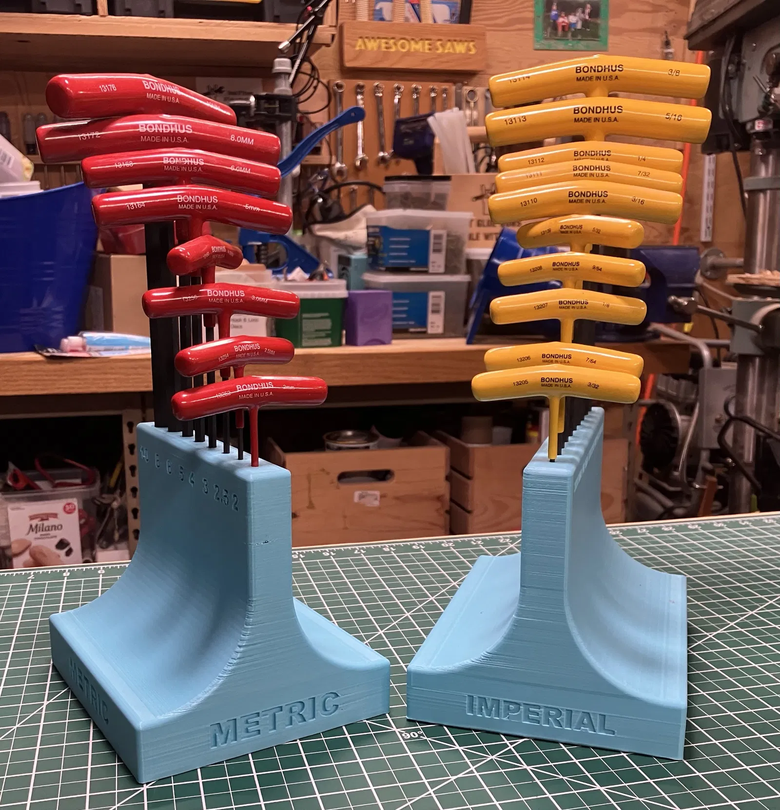 Bộ giá đỡ cho chìa khóa lục giác T-handle, có hai mẫu: một cho hệ mét (giữ 8 cây) và một cho hệ inch (giữ 10 cây). In trên Ender 3 V3 SE với PLA, đầu phun 0.4mm, độ cao lớp 0.2mm, 20% infill.