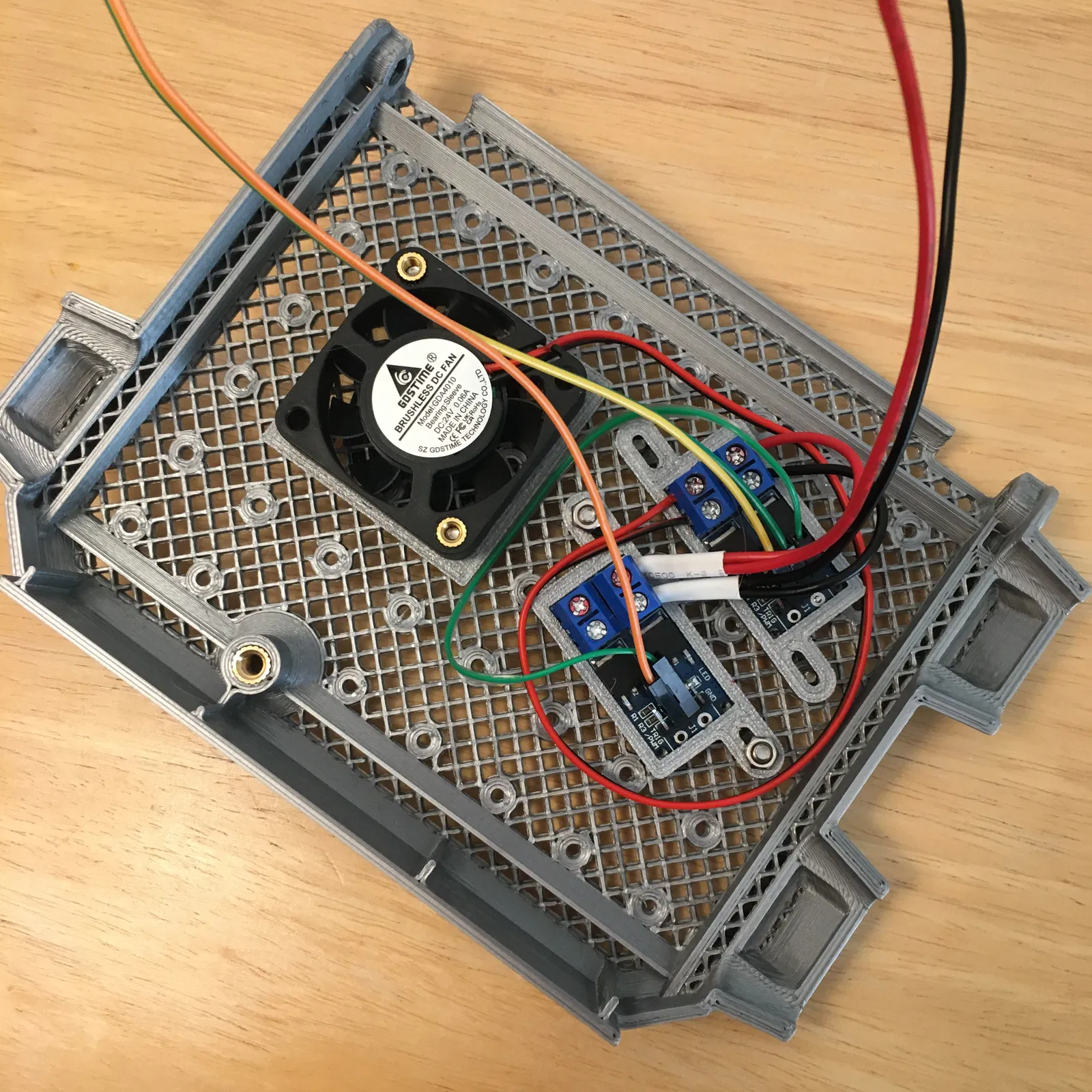 Nắp in 3D có một dãy lỗ 3mm với khoảng cách 32mm giống như trên quạt 4010. Điều này có nghĩa là bạn có thể đặt quạt và mô-đun MOSFET ở bất kỳ đâu bạn muốn và cung cấp các điểm gắn cho các sửa đổi khác. Xem ảnh đính kèm để biết cách bố trí của tôi.